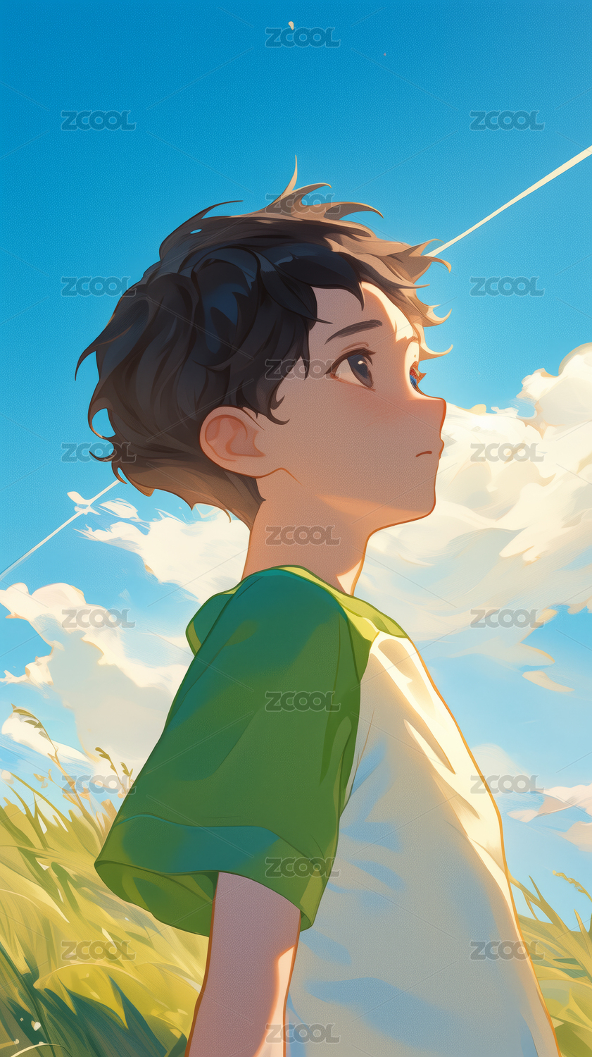 卡通可爱奔跑的男孩天空气球梦幻治愈插画