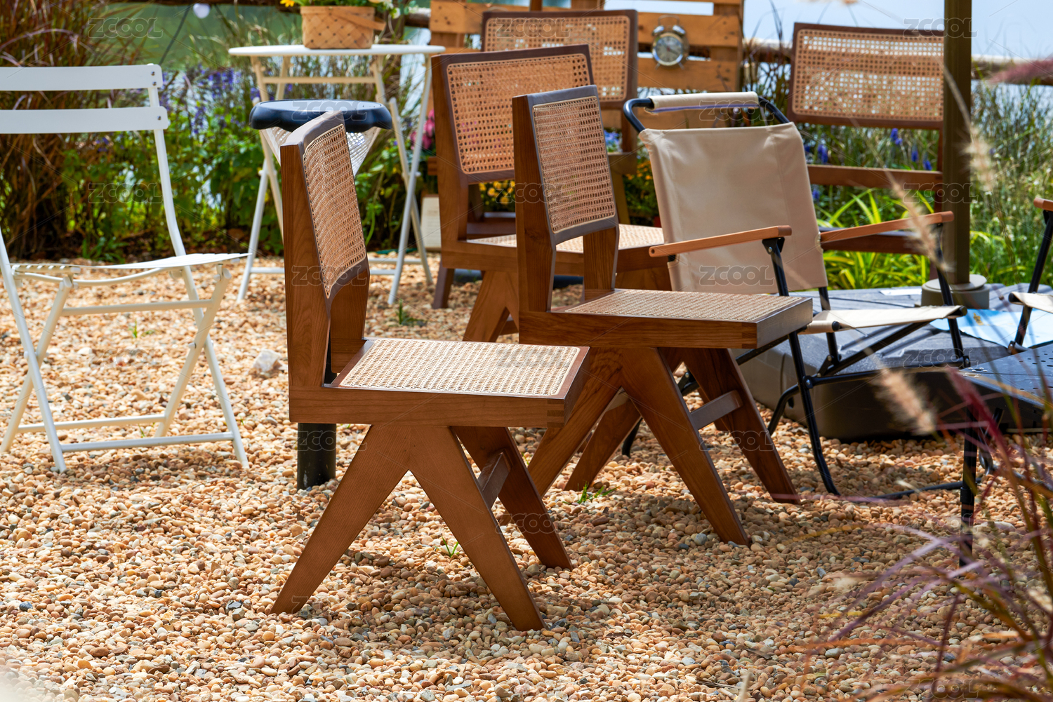 户外藤编家具与木质餐桌的庭院场景