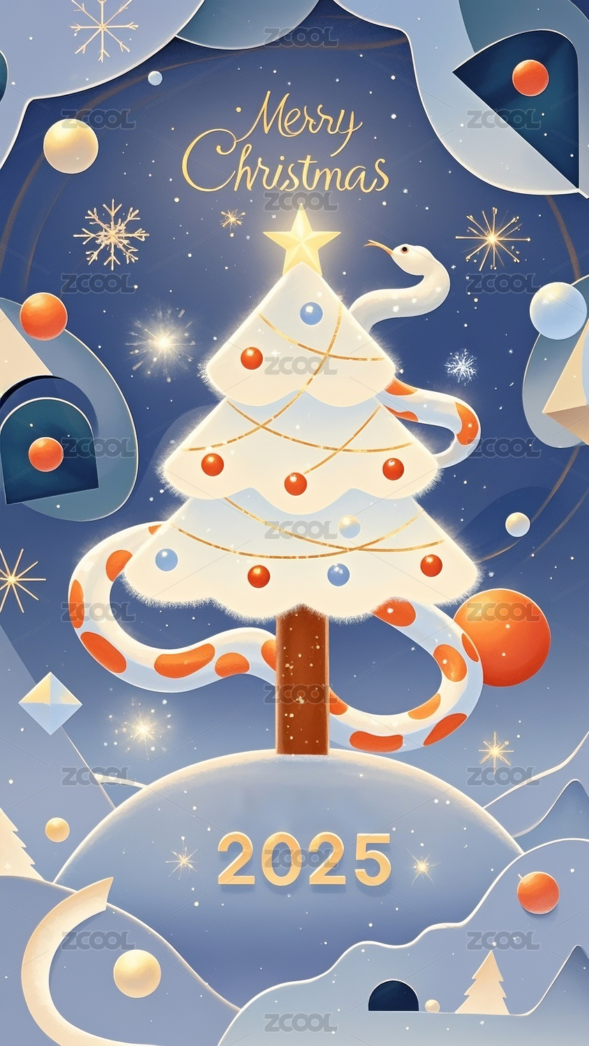 圣诞节雪人节日礼物插画冬天圣诞树背景海报