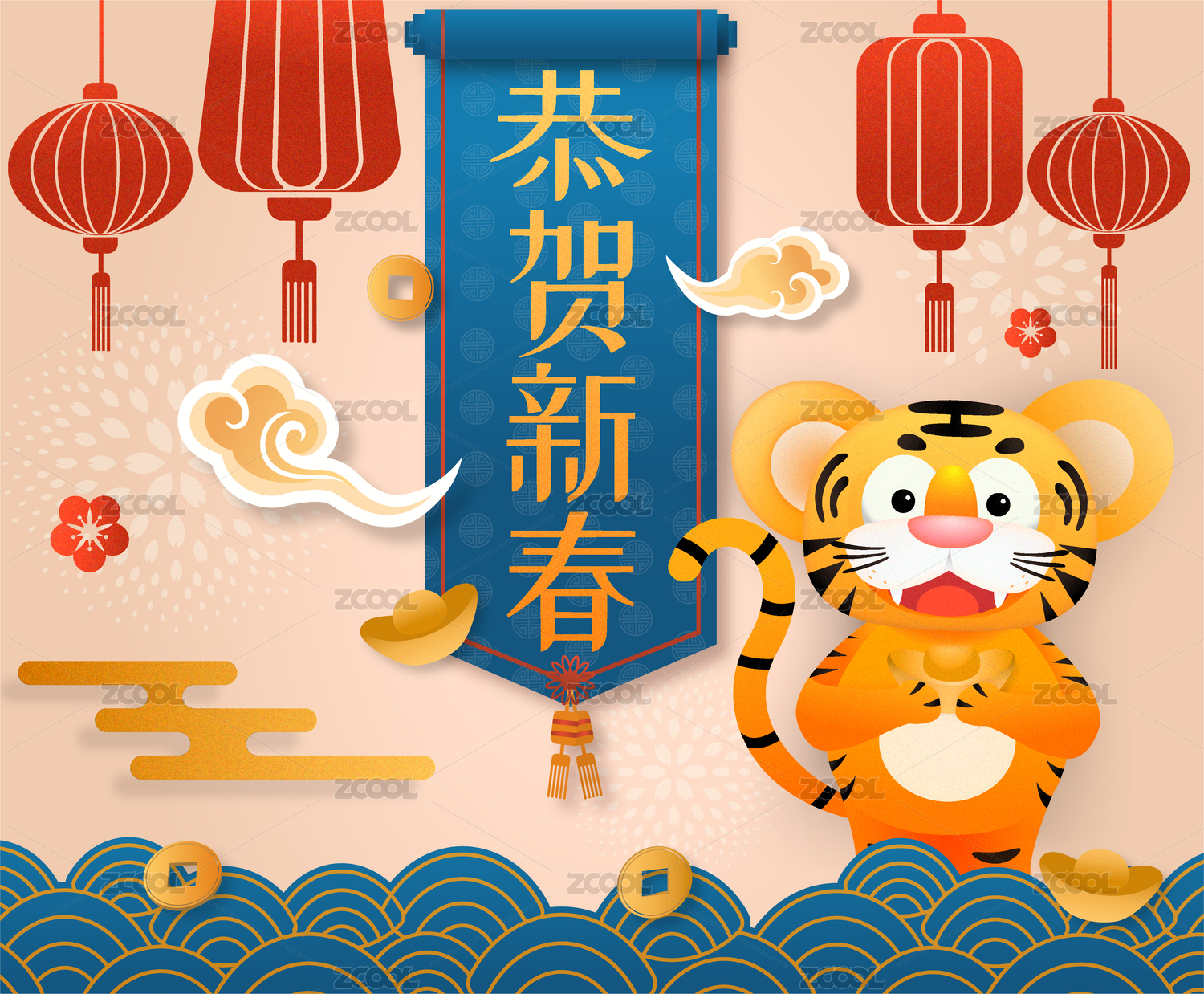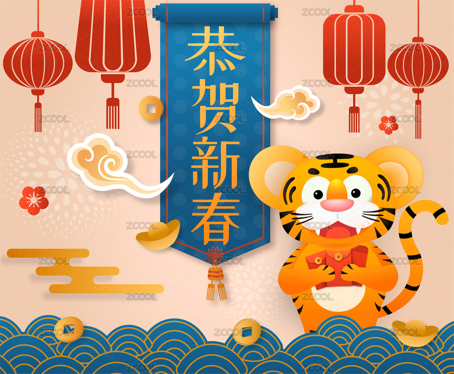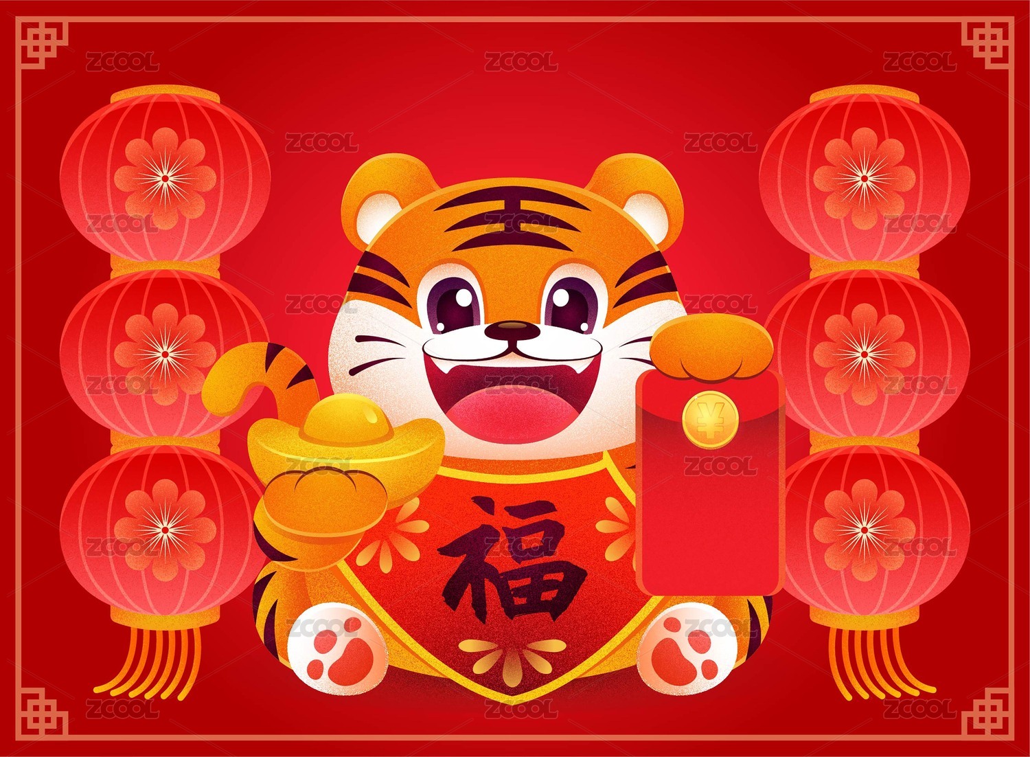 虎年手捧红包的老虎恭喜新春插画素材海报