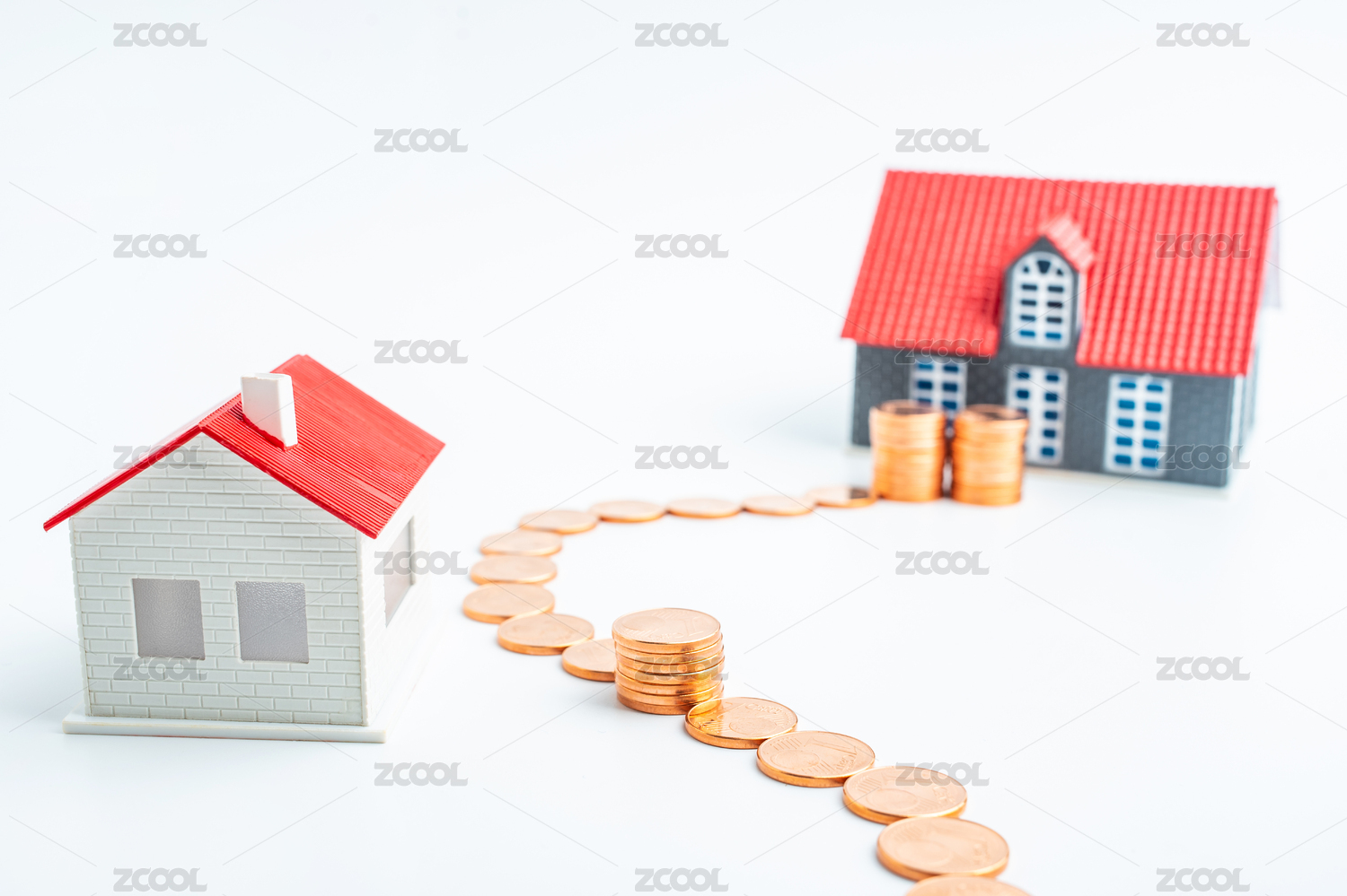 桌子上的文件资料和资料上的美元硬币和小房子模型