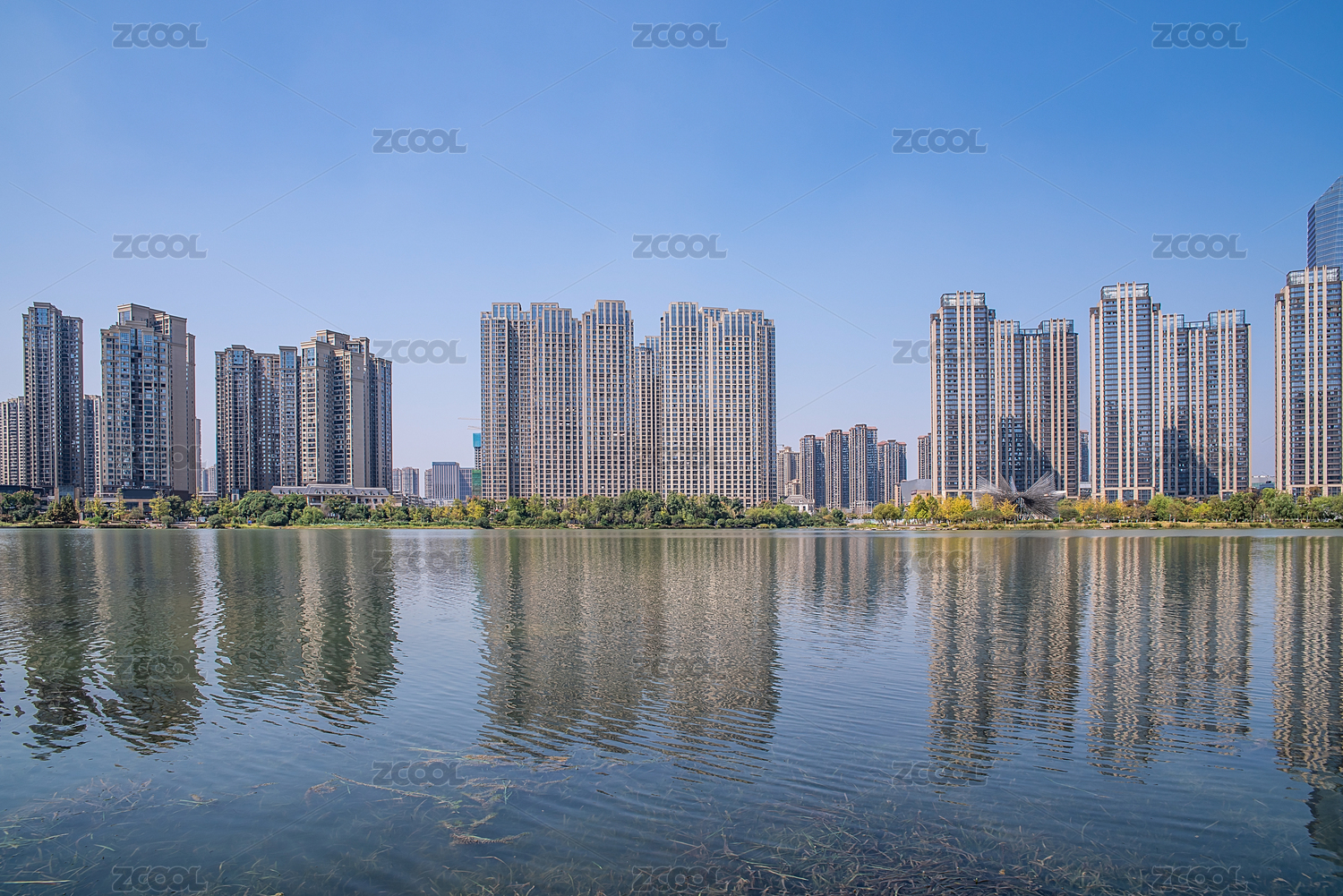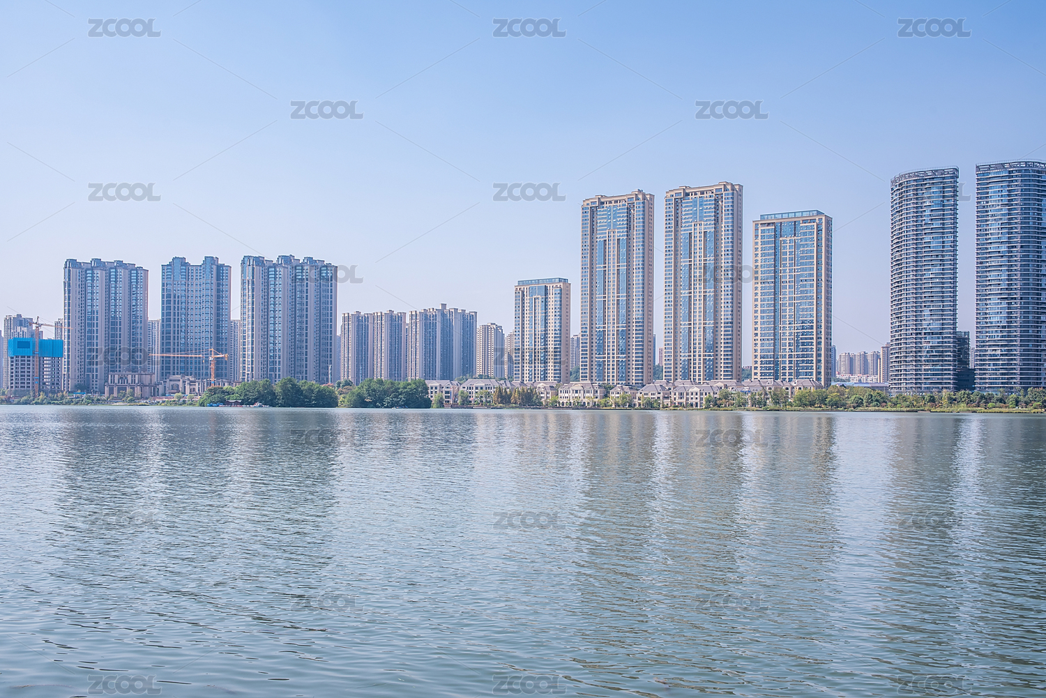 中国湖南省长沙市梅溪湖水岸密集的高层楼盘全景图