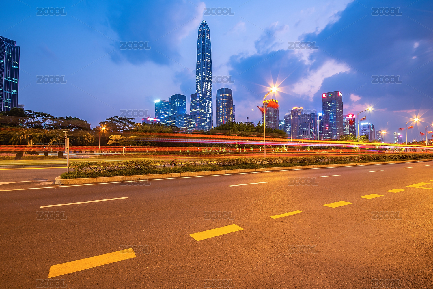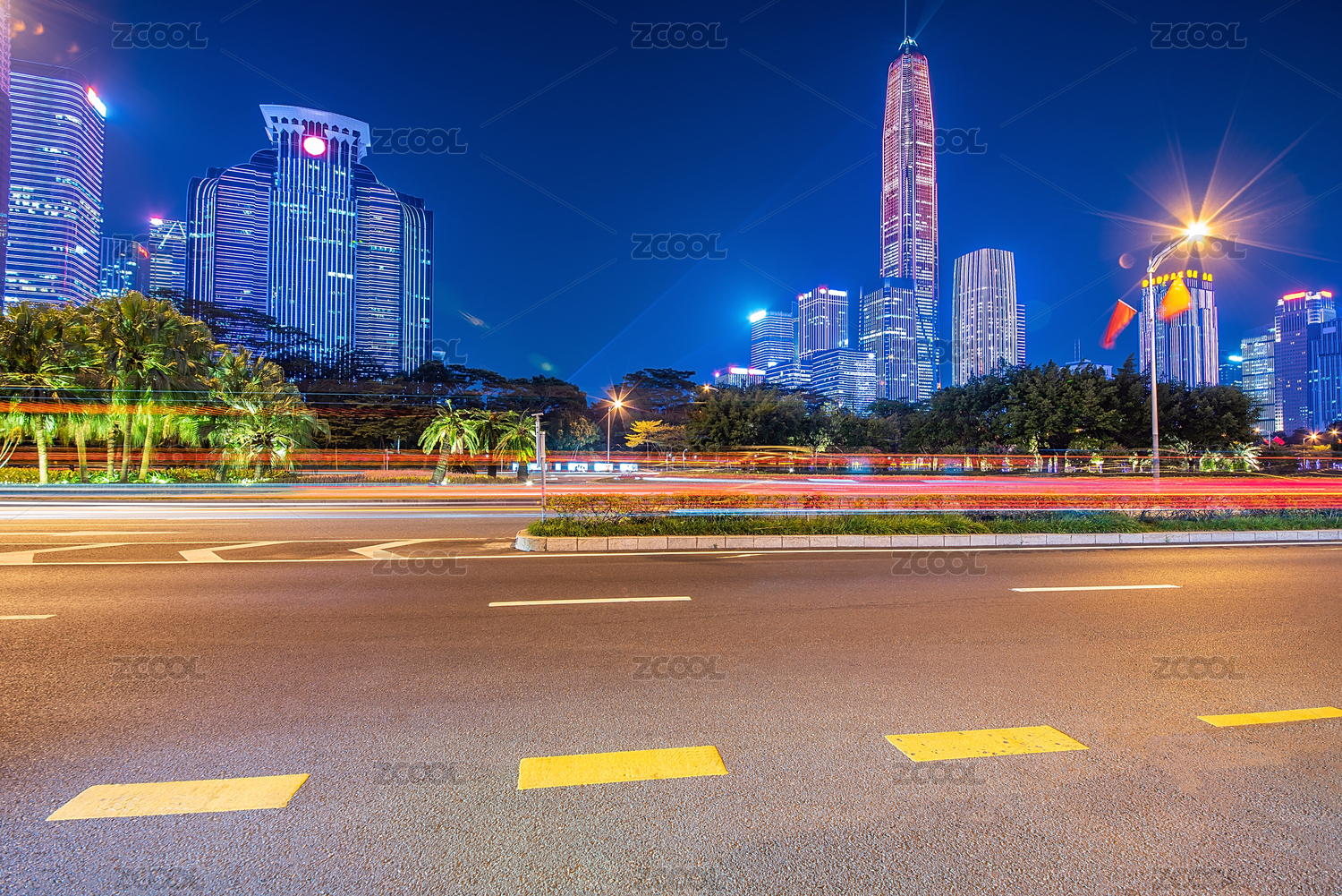 中国广东省深圳市福田CBD天际线夜景风光和沥青马路创意合成