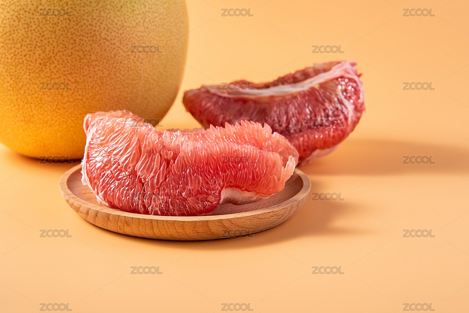 木垫子上放着一盘剥开的三红蜜柚果肉