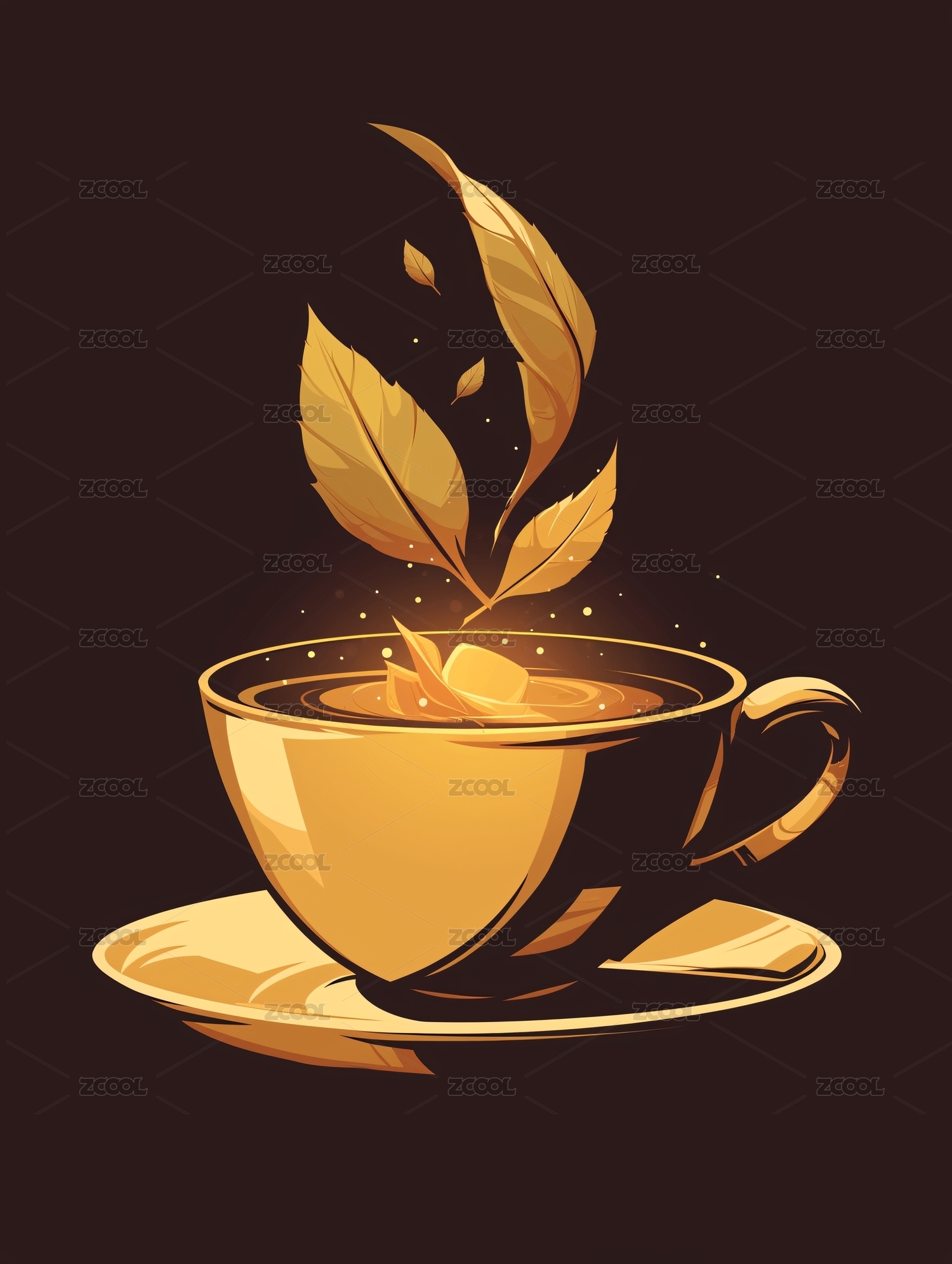 金色茶杯飘出金色叶片