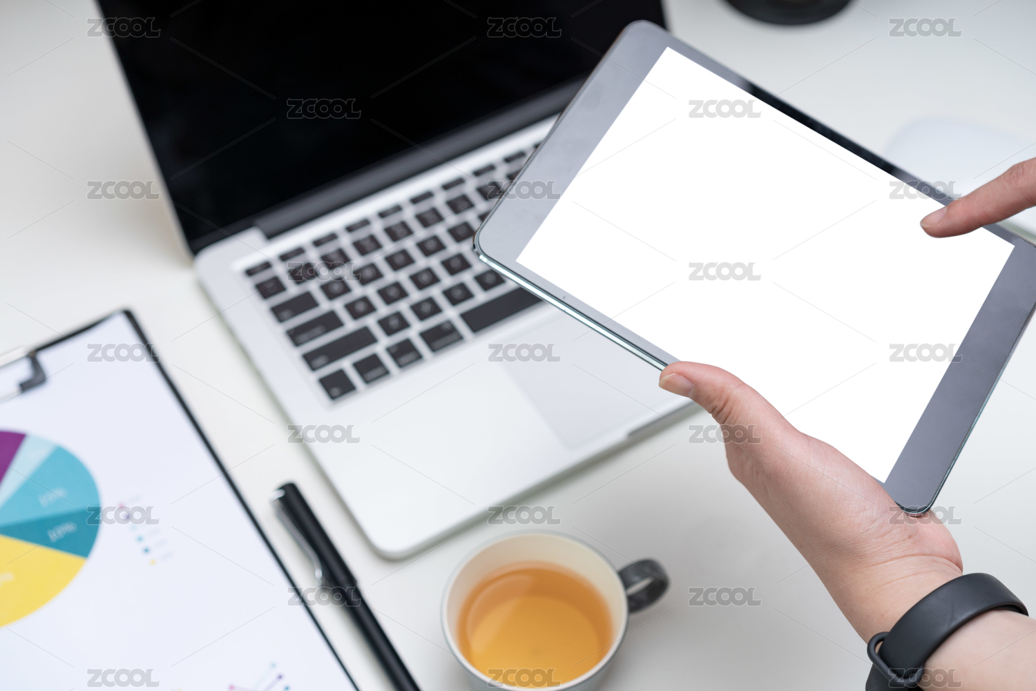 显示黑屏近商人COPYSPACE数字平板电脑与她的智能手表和笔记本电脑上网在桌子上的工作连接。
