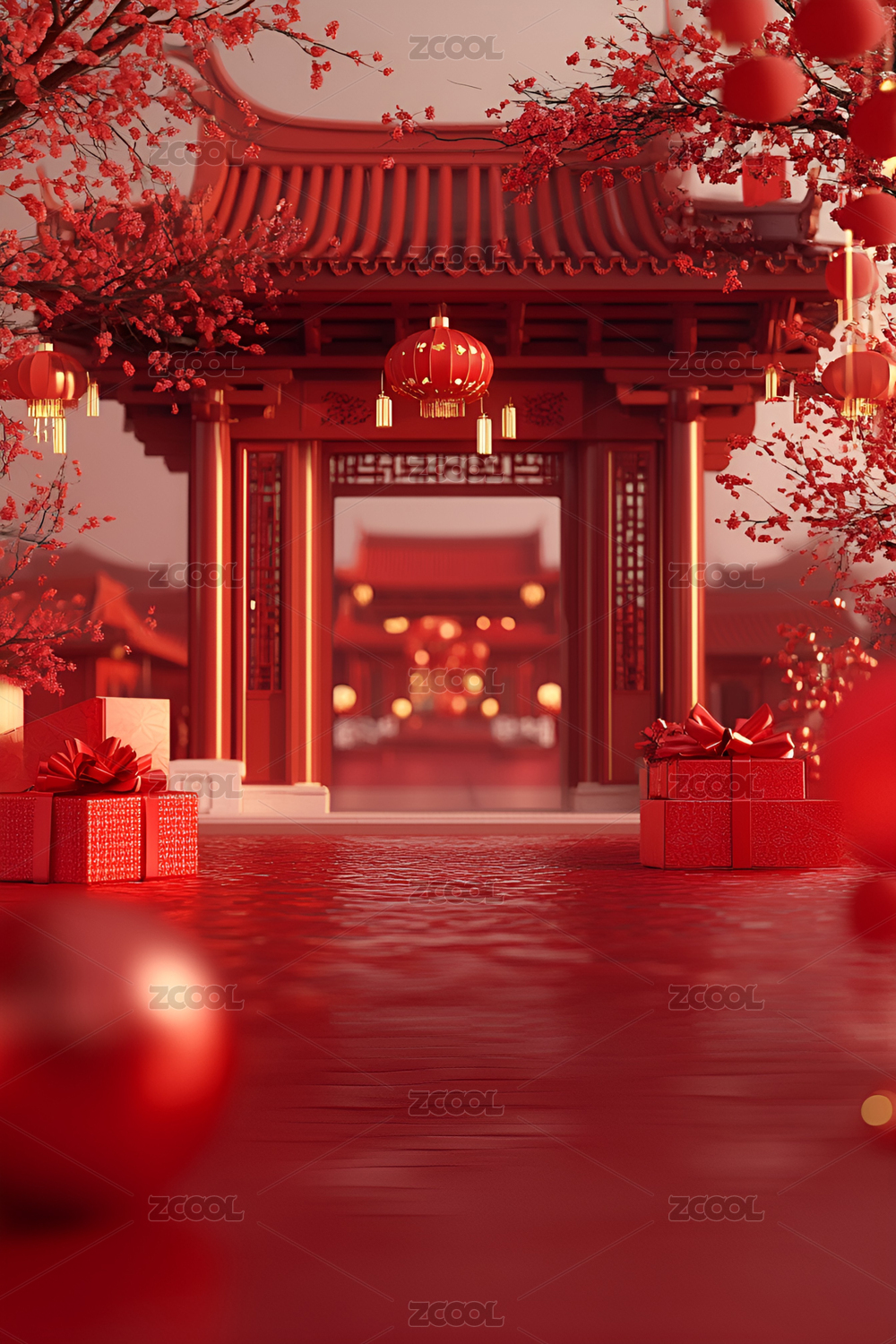 国风国潮新中式节日挂灯笼的中国红古典大门