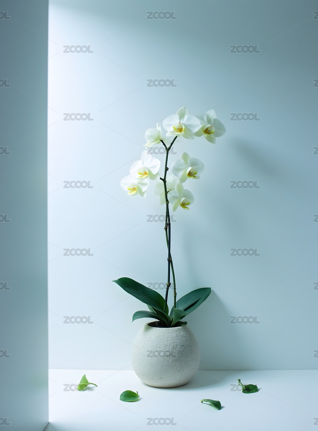桌上铁壶边一株种在花瓶里处于阳光下的蝴蝶兰
