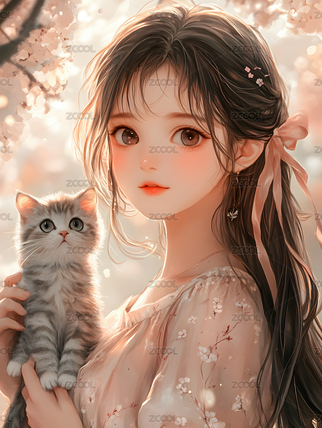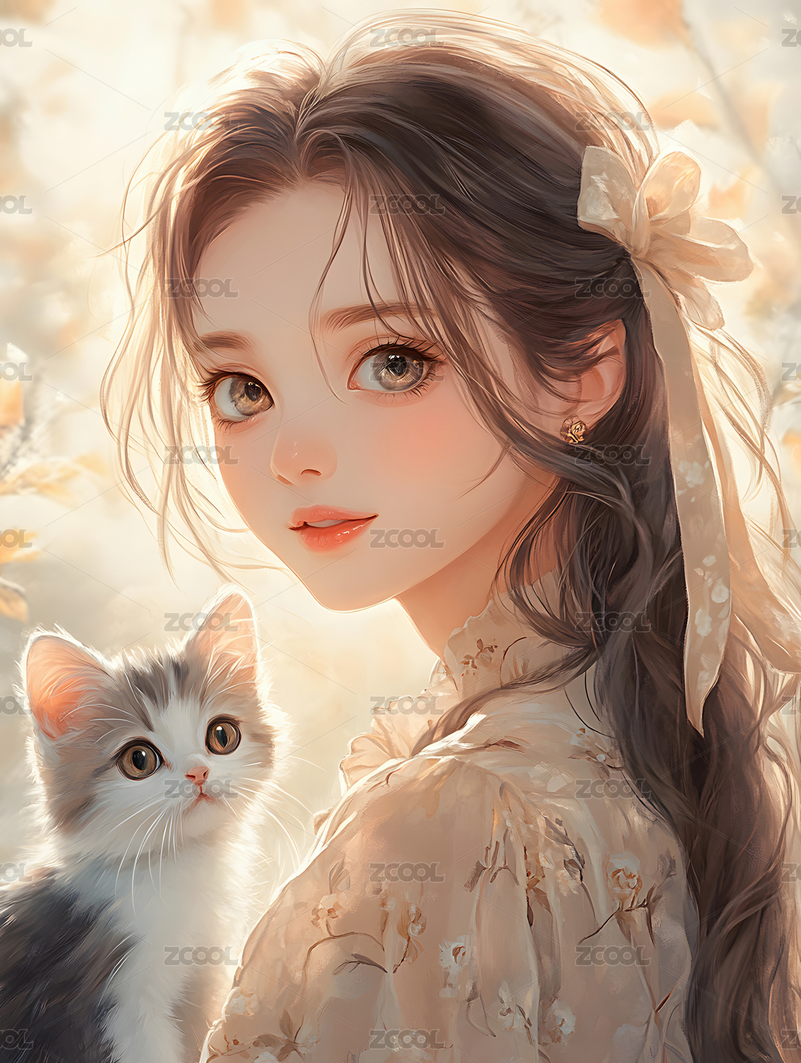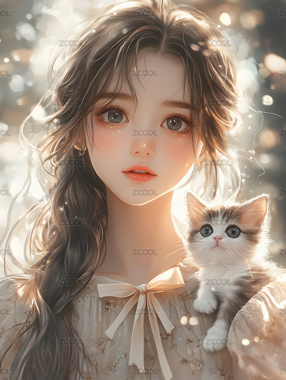少女怀中抱着一只小白猫
