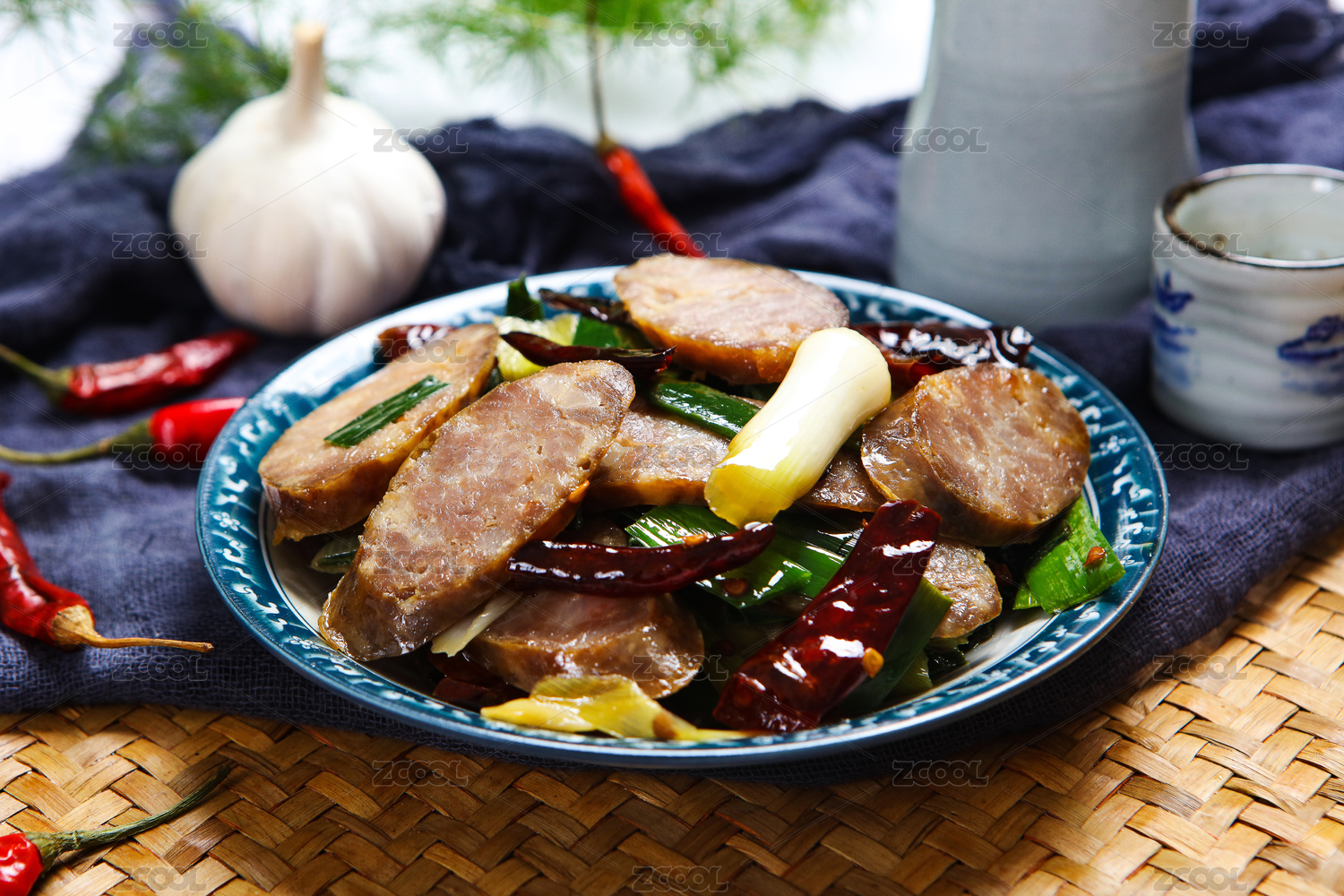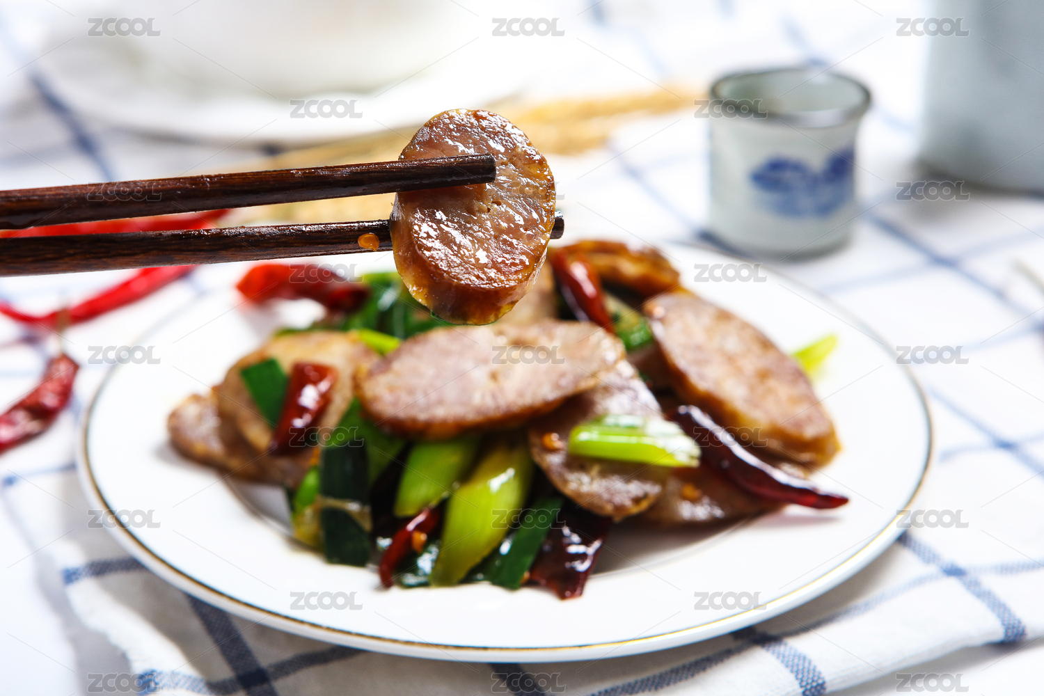 美味农家菜干辣椒蒜苗炒腊肠