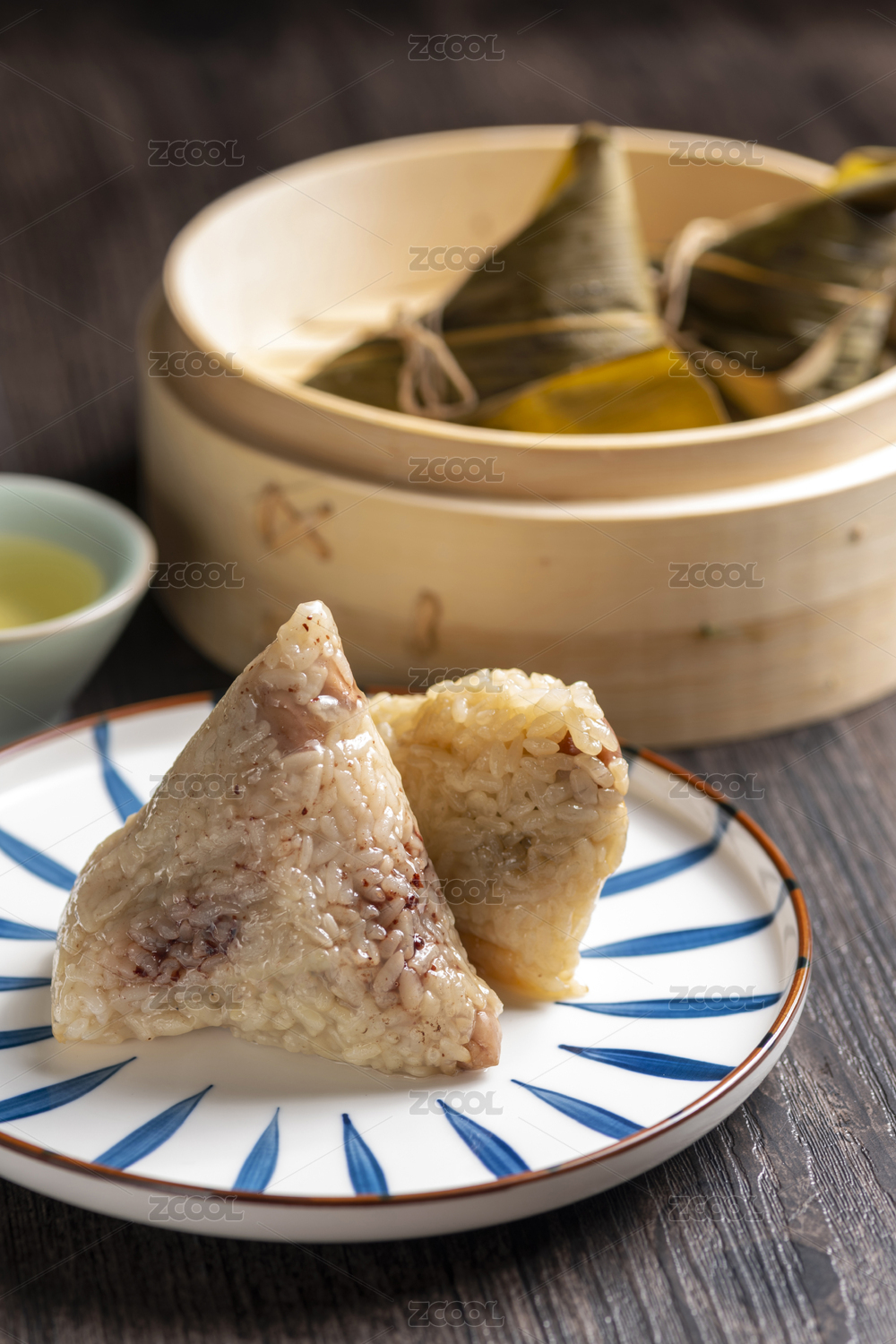 木桌上放在蒸笼里的粽子
