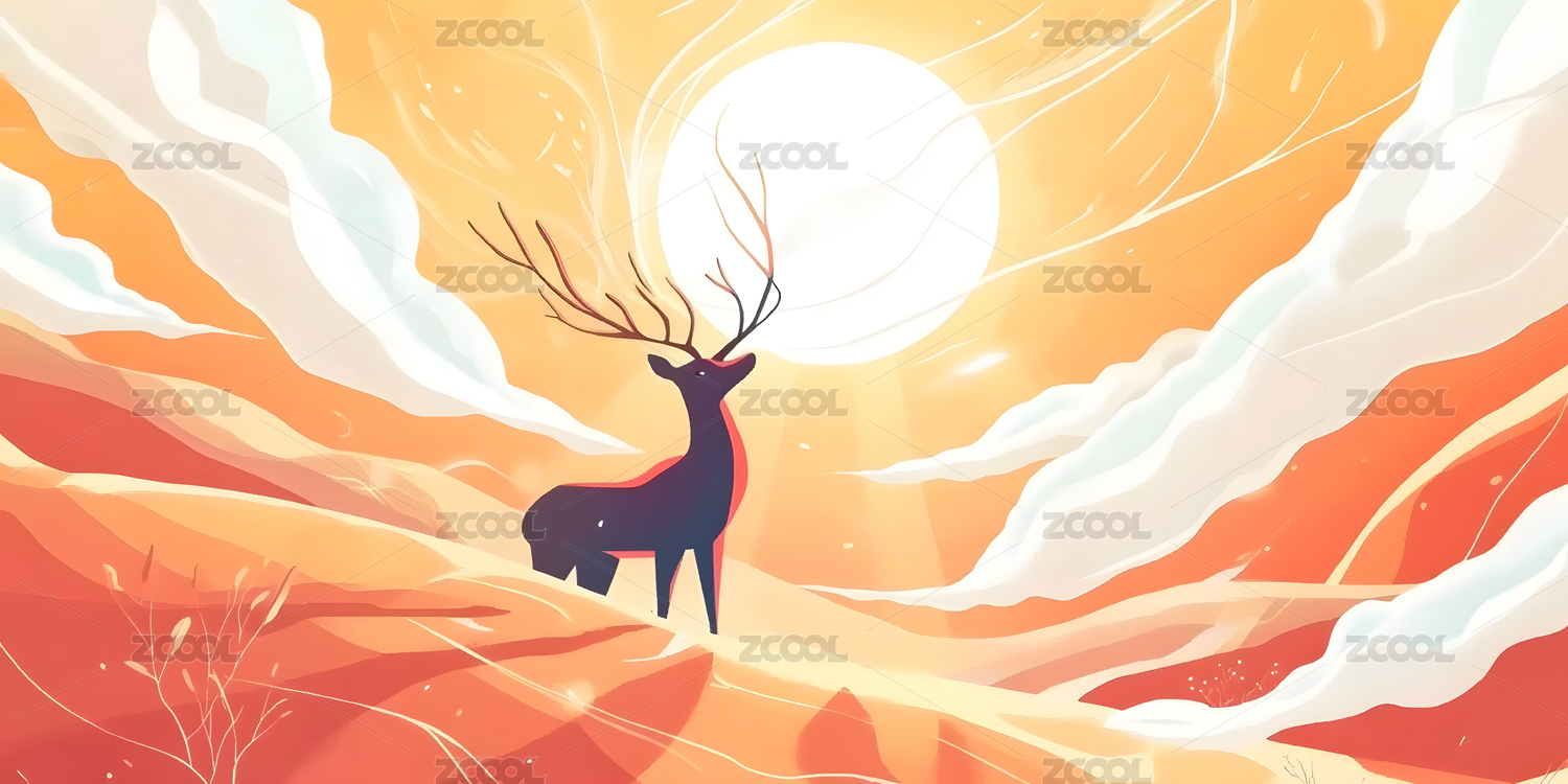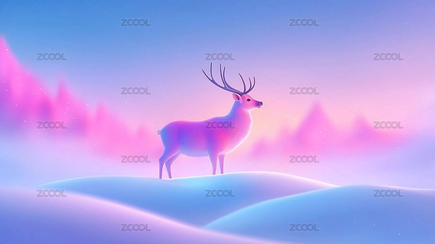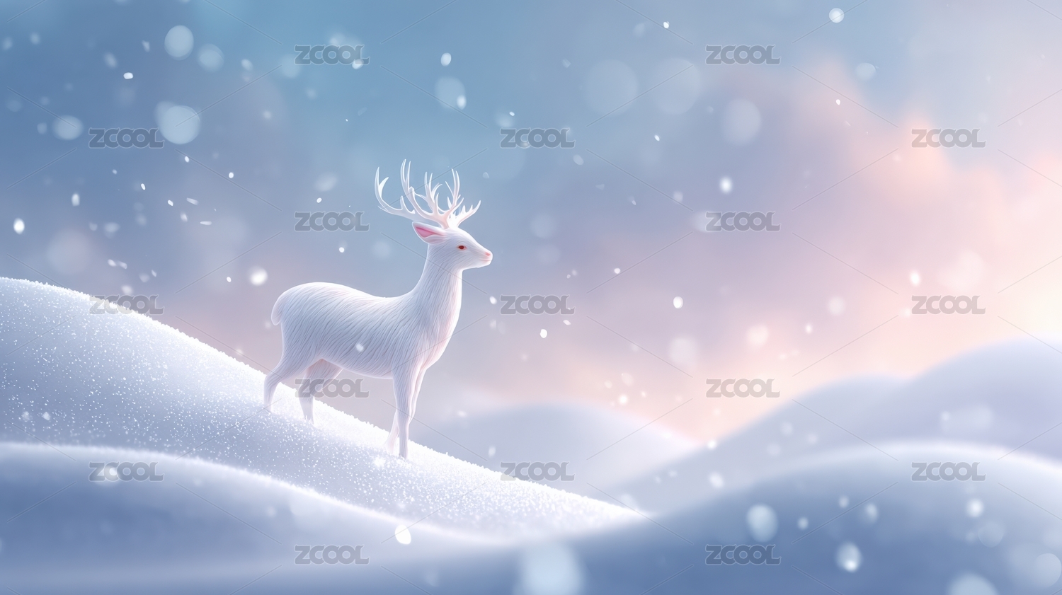 3d唯美风格冬季雪景一只鹿站在雪地里