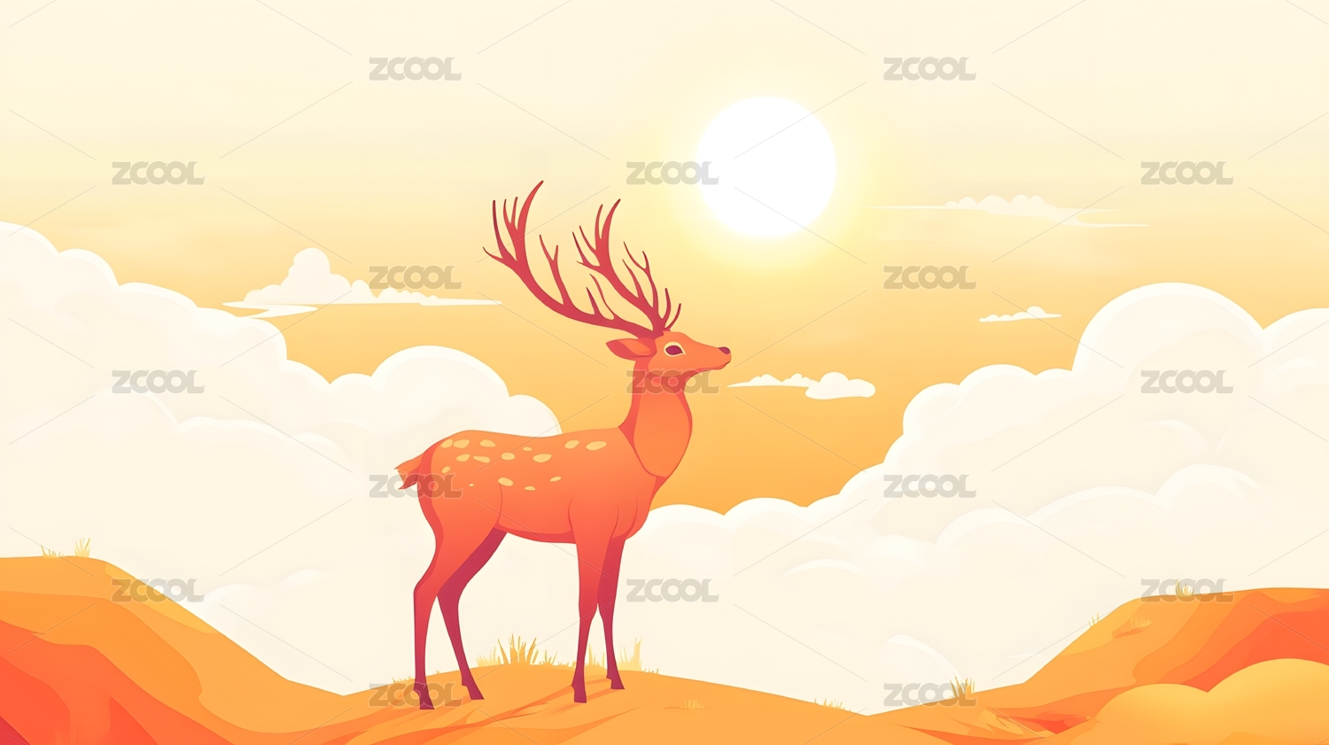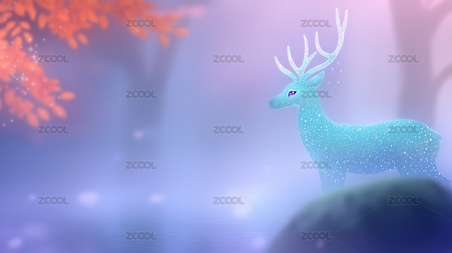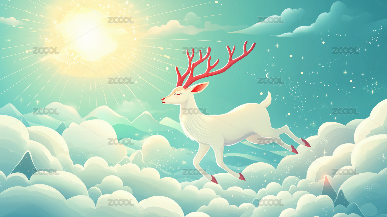 3d唯美风格冬季雪景一只鹿站在雪地里