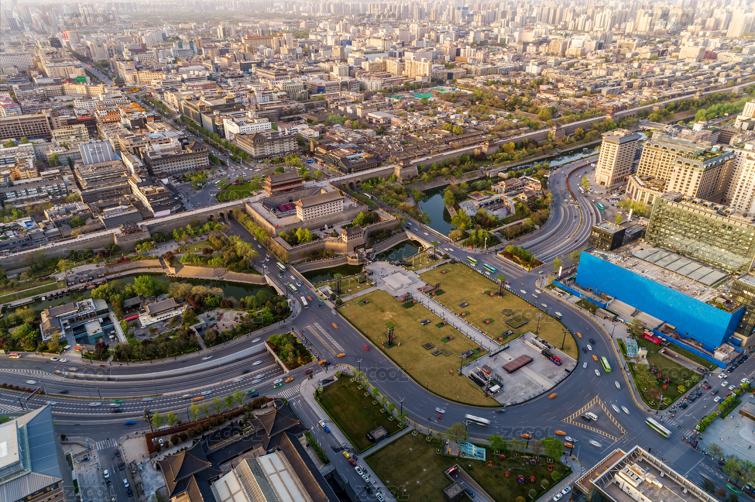 中国浙江省杭州市西湖区文二路西溪航拍夕阳