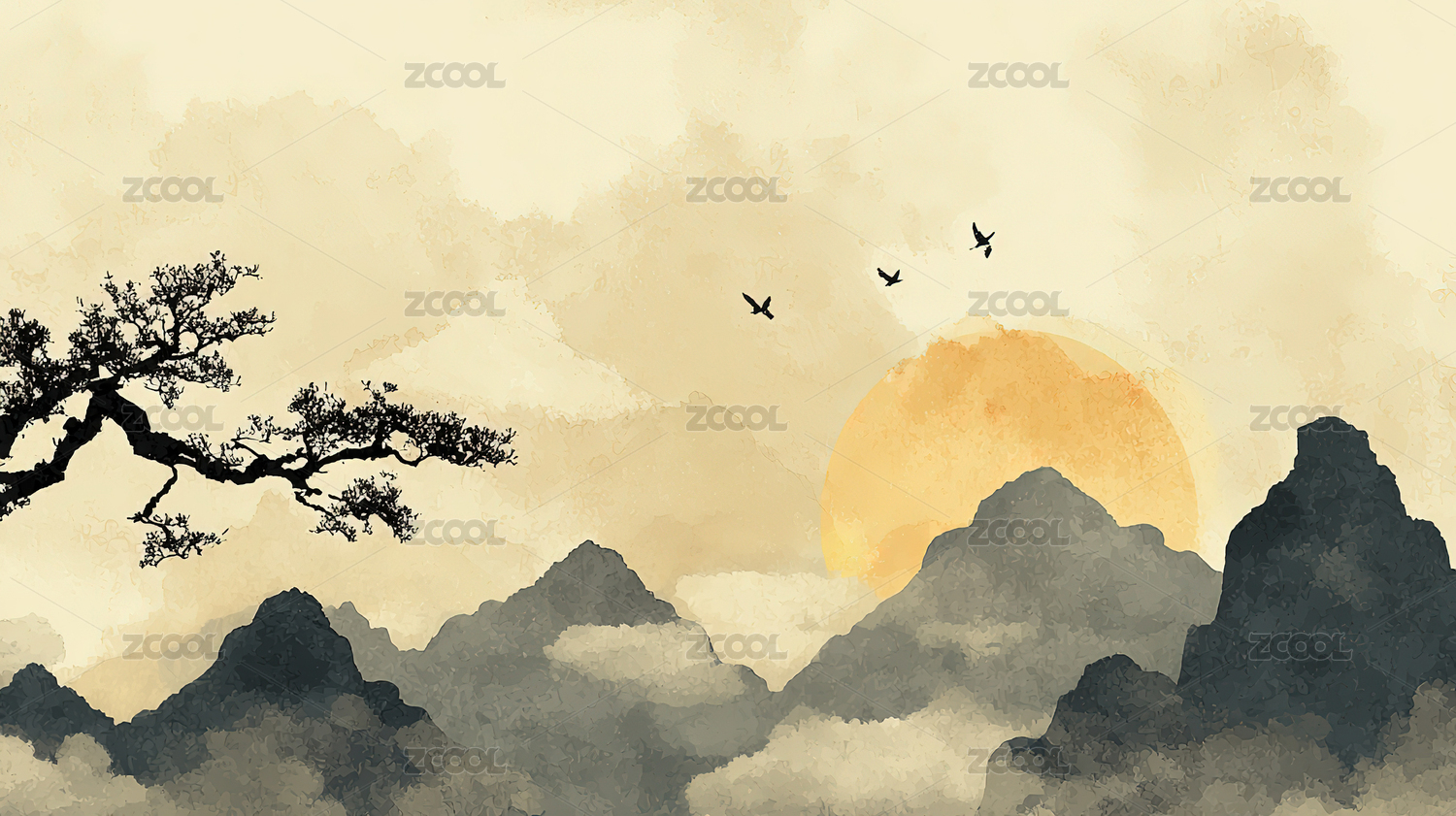 中国传统中国风抽象山峰参天松树诗意水墨画