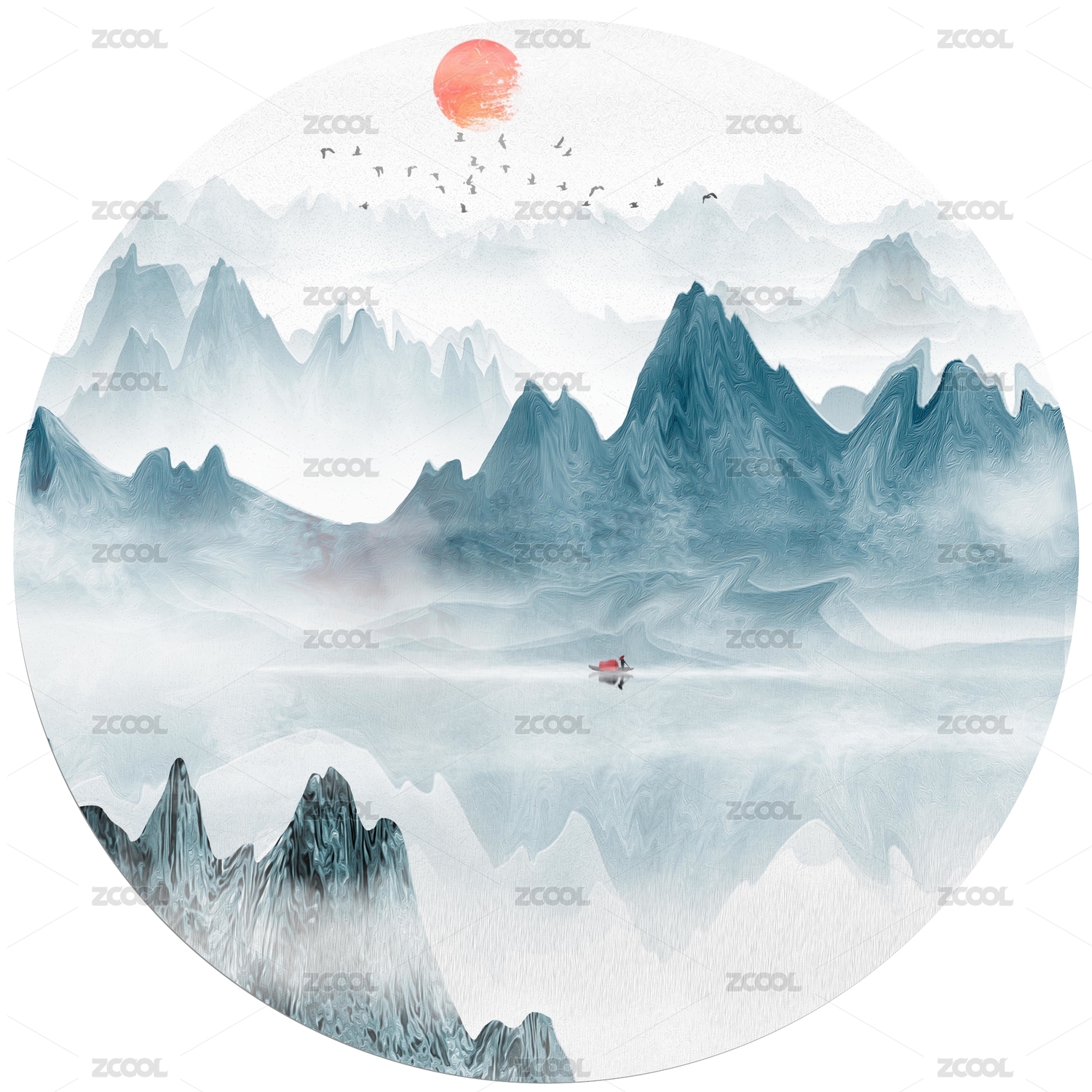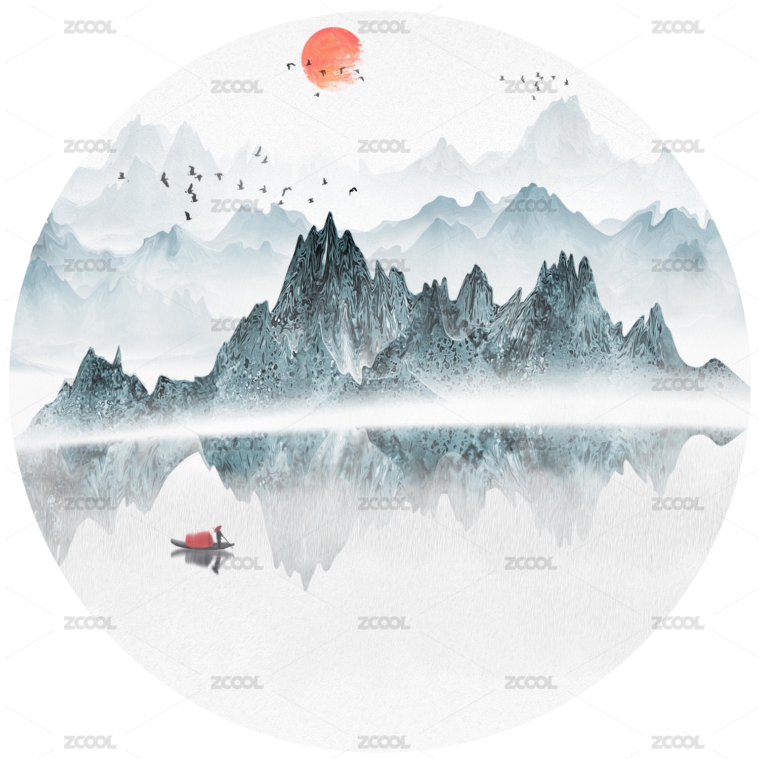 高山湖水圆形意境水墨装饰矢量分层背景图