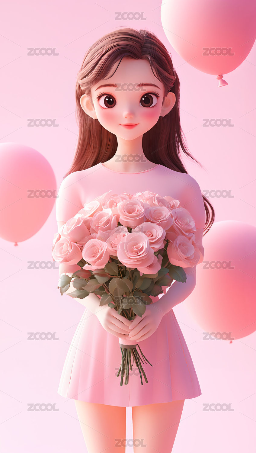 一位黑色长发女性拿着礼盒彩屑节日3D插画