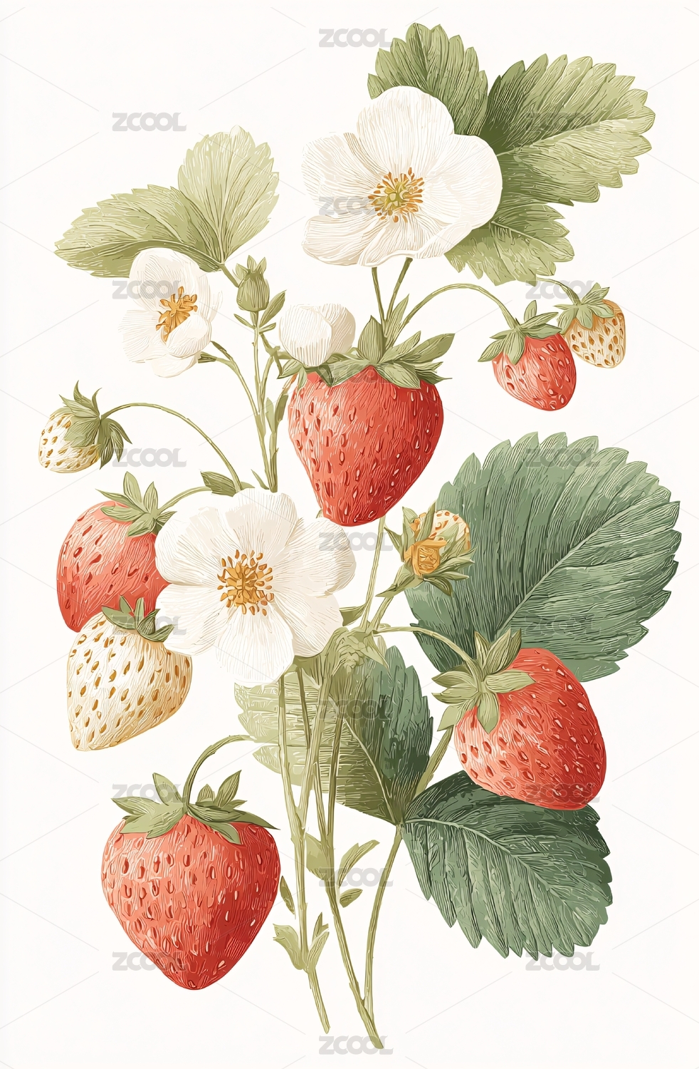 白底手绘草莓插图,茎上长出绿叶和花朵