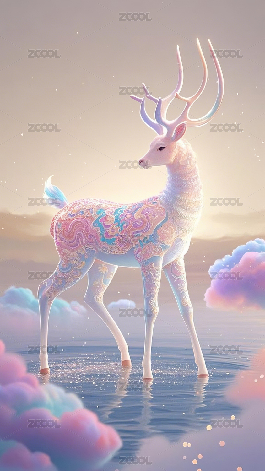 3D渲染国潮风插画梦幻唯美发着光的神鹿