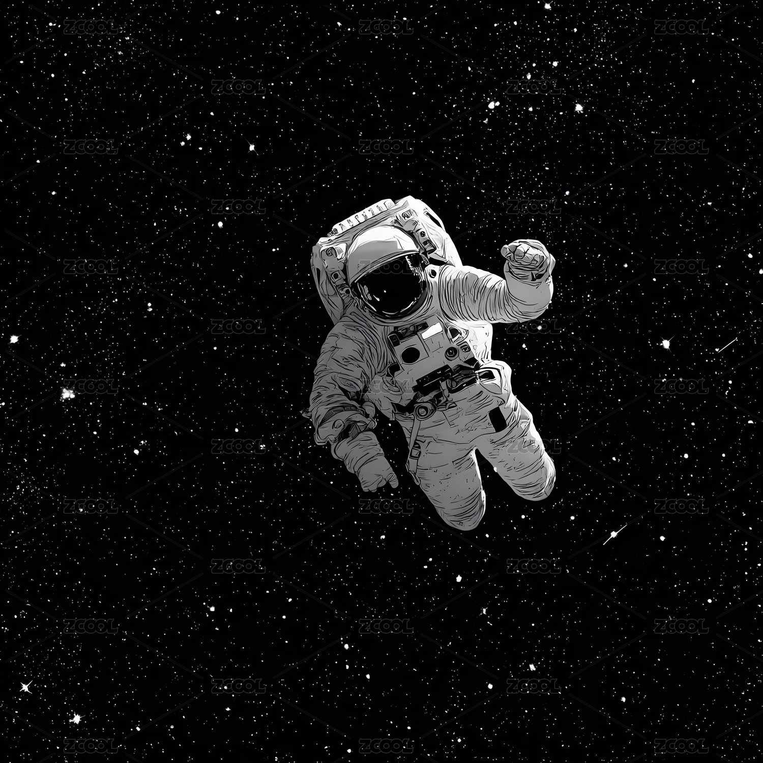 宇航员和飞船在太空中,黑白色宇宙卡通漫画