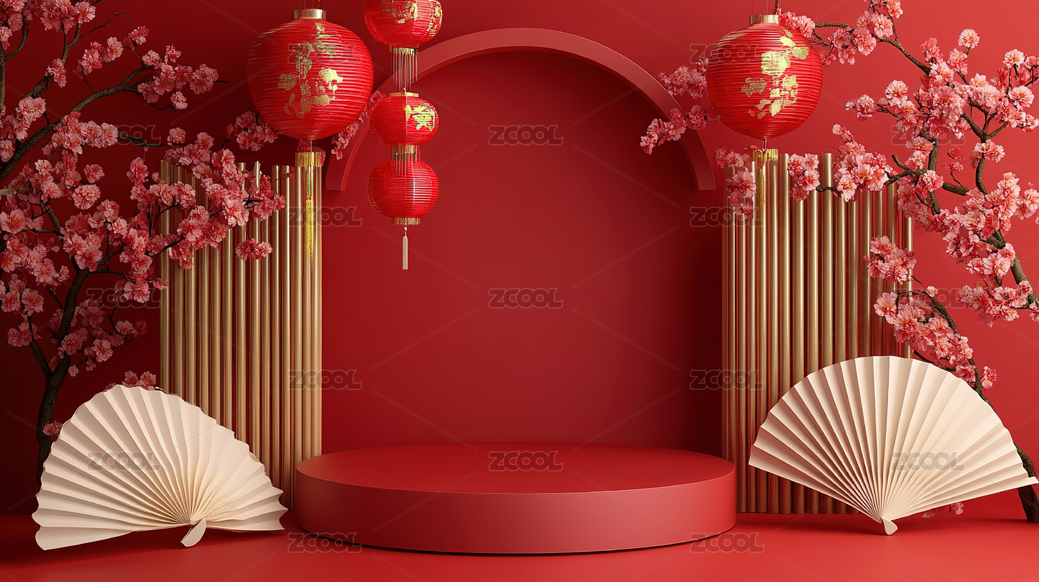 红色圆形中国风新年展台场景