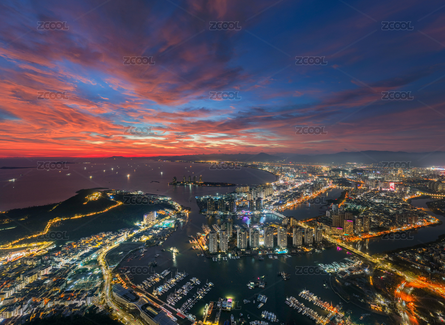 大湾区珠海澳门香洲湾情侣路晚霞航拍全景图