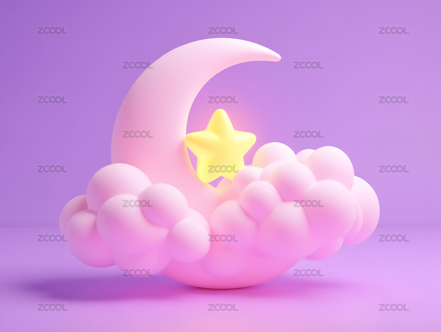 3D卡通毛绒质感紫色云朵中的月亮