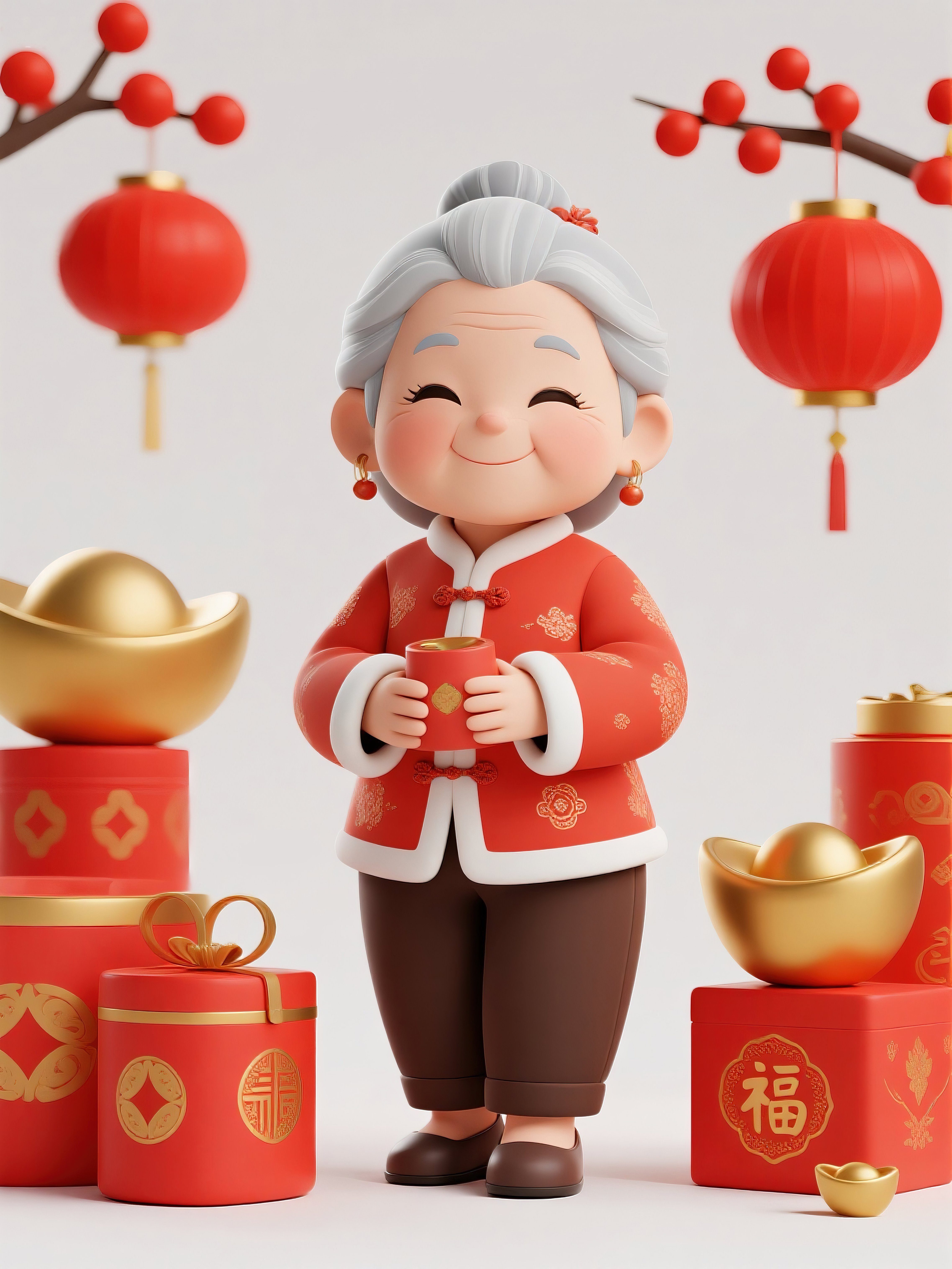 白发老奶奶拿着红包礼盒喜庆新年节日插画