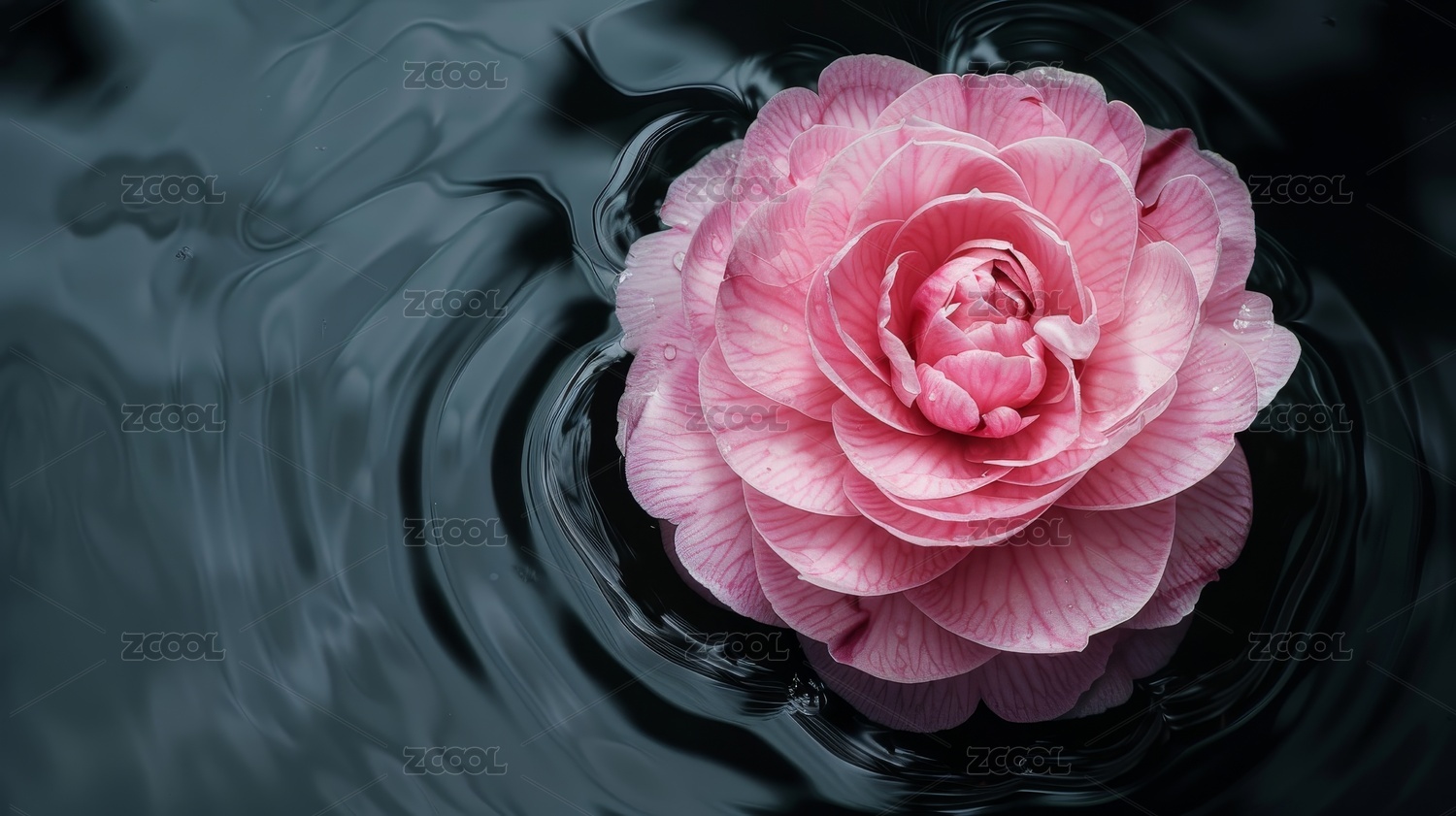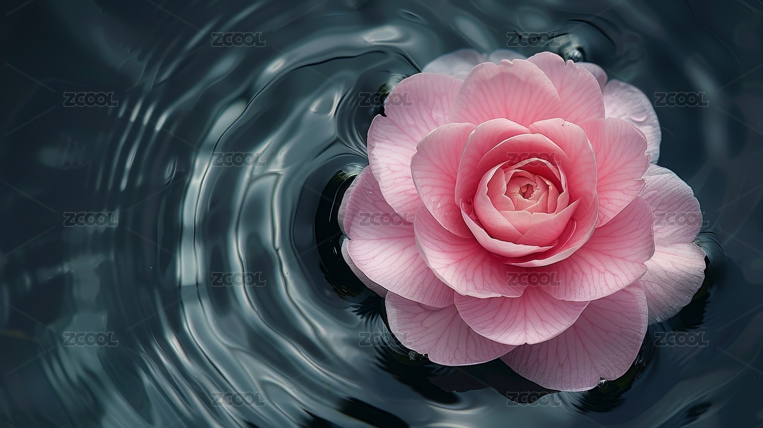 一朵粉红色的玫瑰花浮在水面上泛起波纹