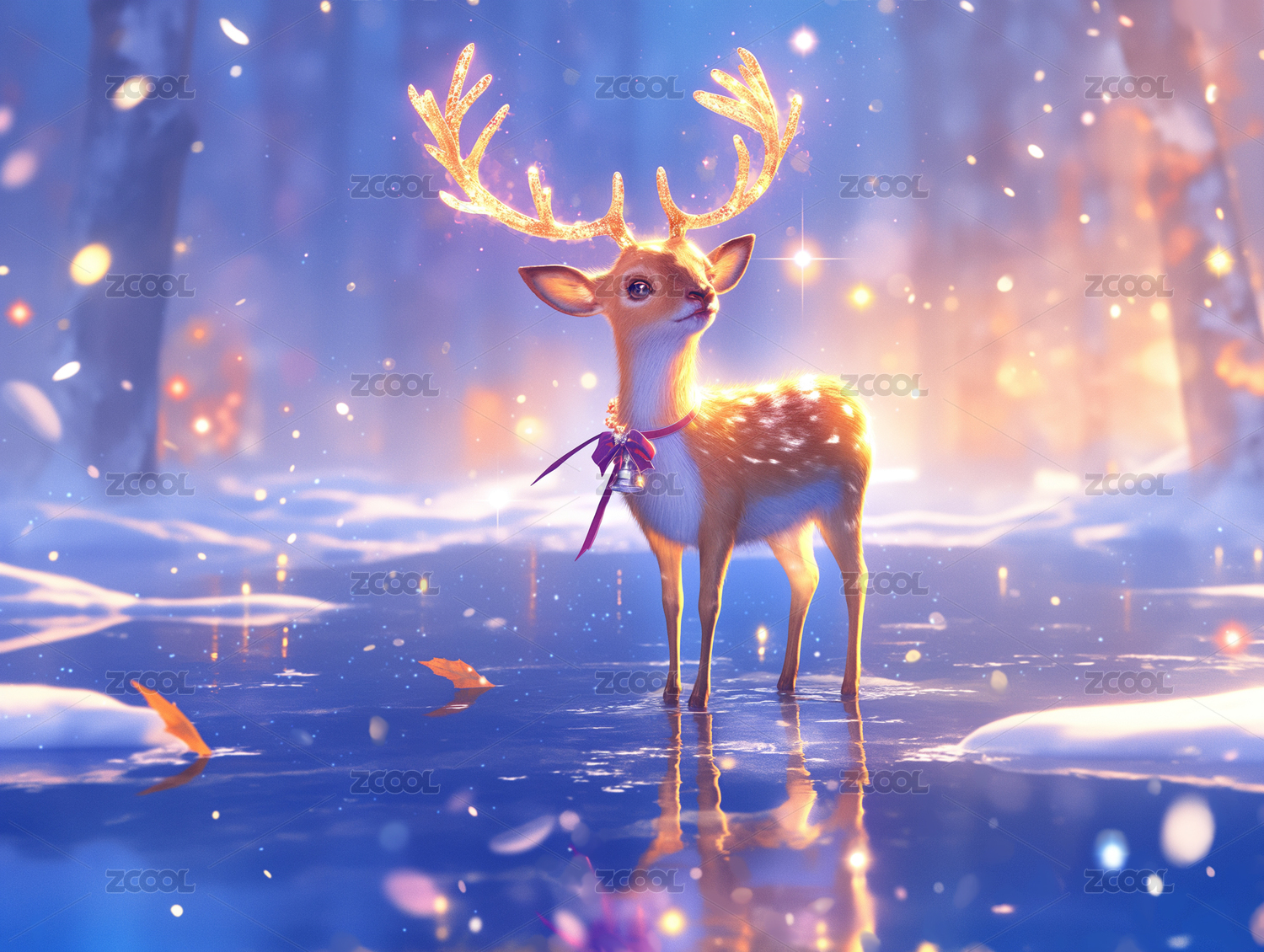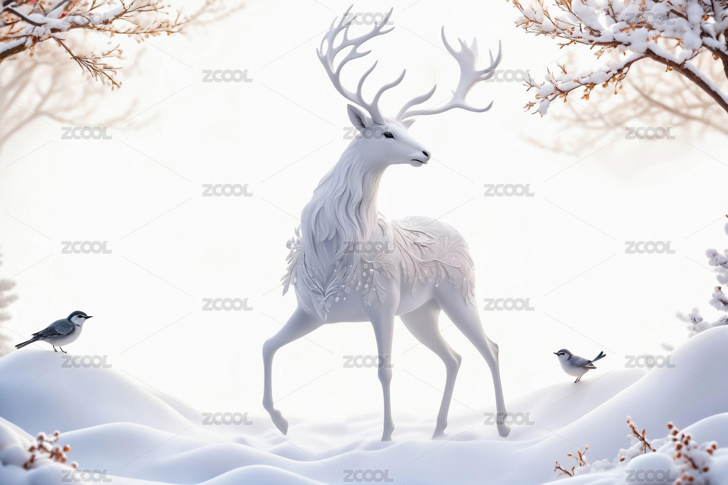 3d唯美风格冬季雪景一只鹿站在雪地里