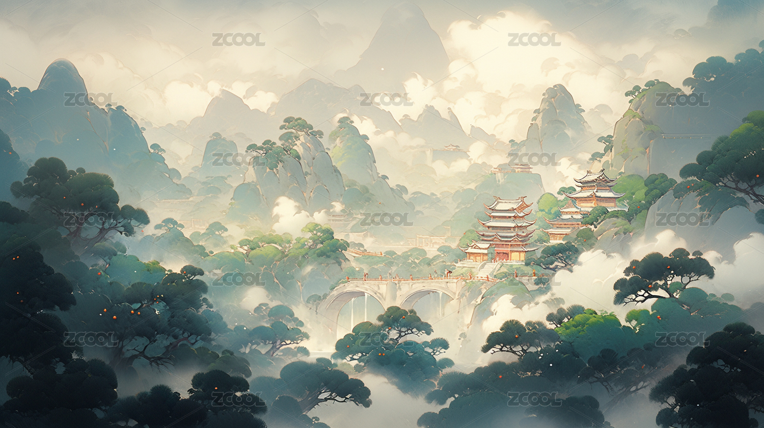 竹林,山峰,茶馆,溪流,国风,自然,风光,水墨