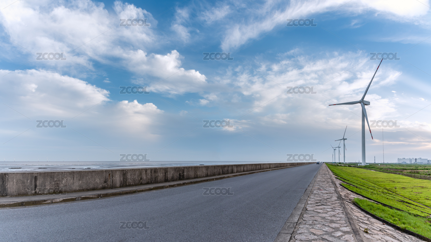 夕阳下中国上海的大海风车道路背景