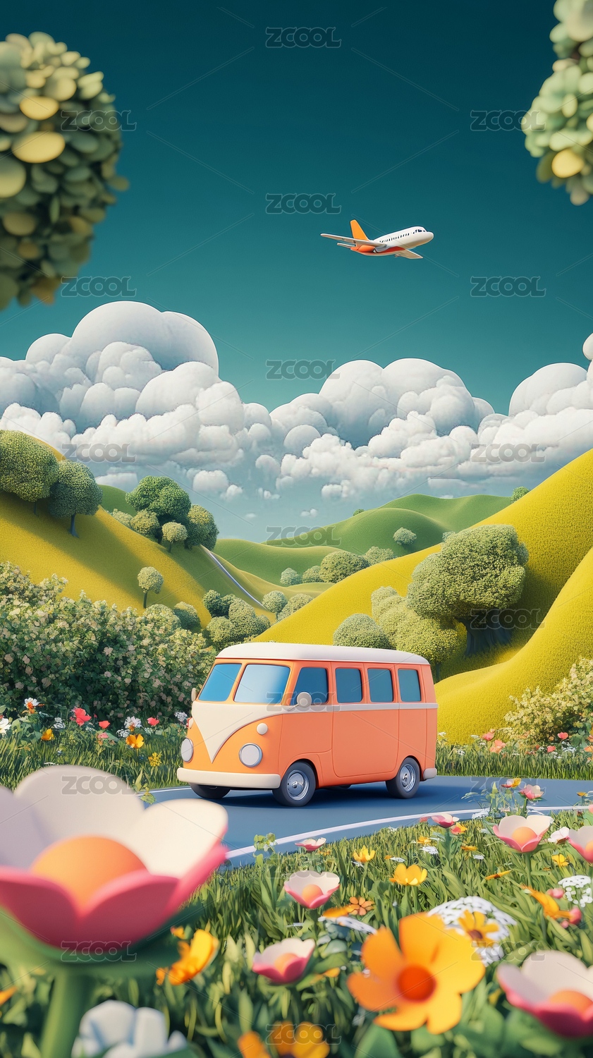 三维,立体,3D,卡通,田园,风景,花朵,阳光,可爱,插画