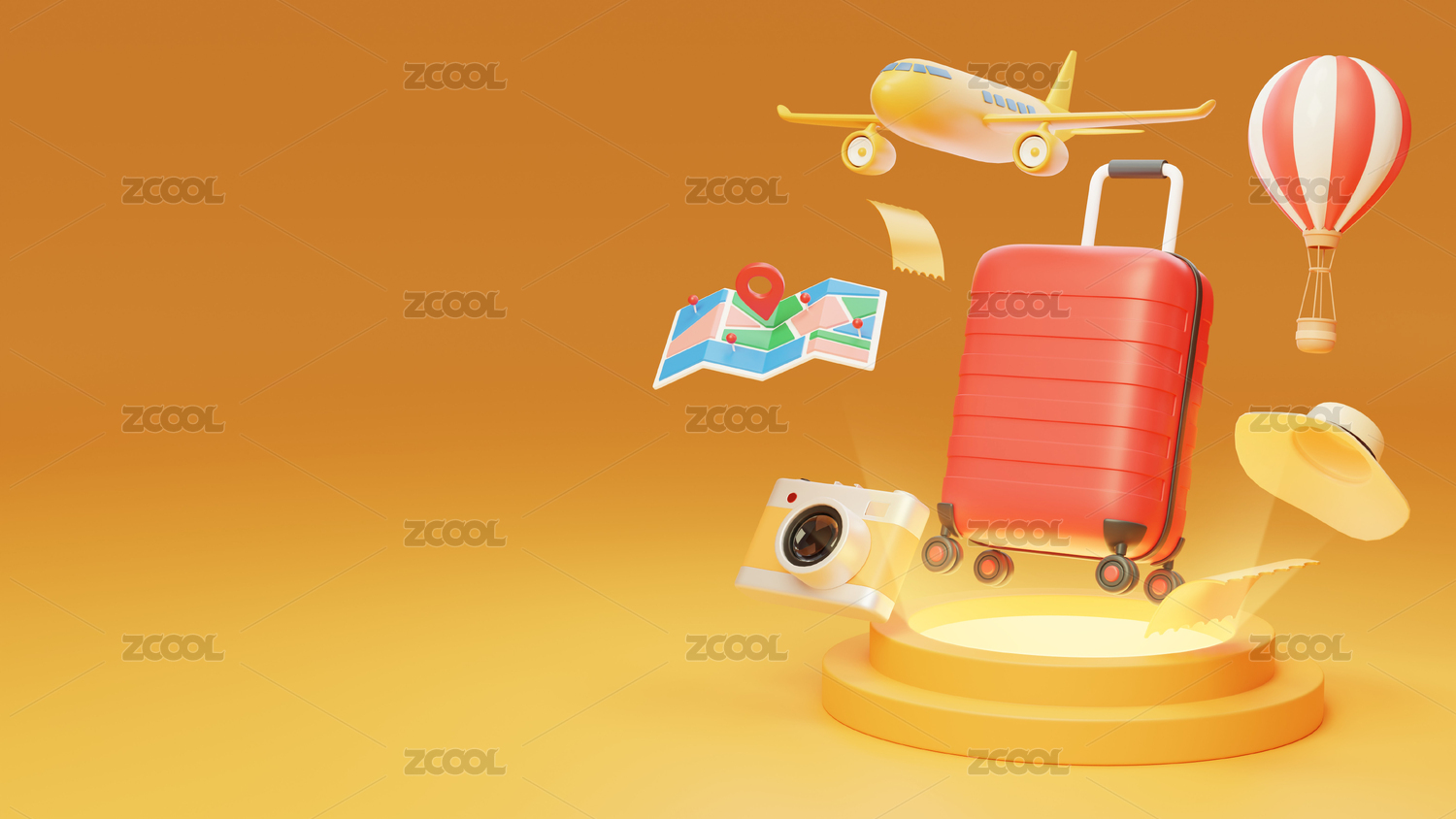 3D渲染的卡通旅行用品组合场景