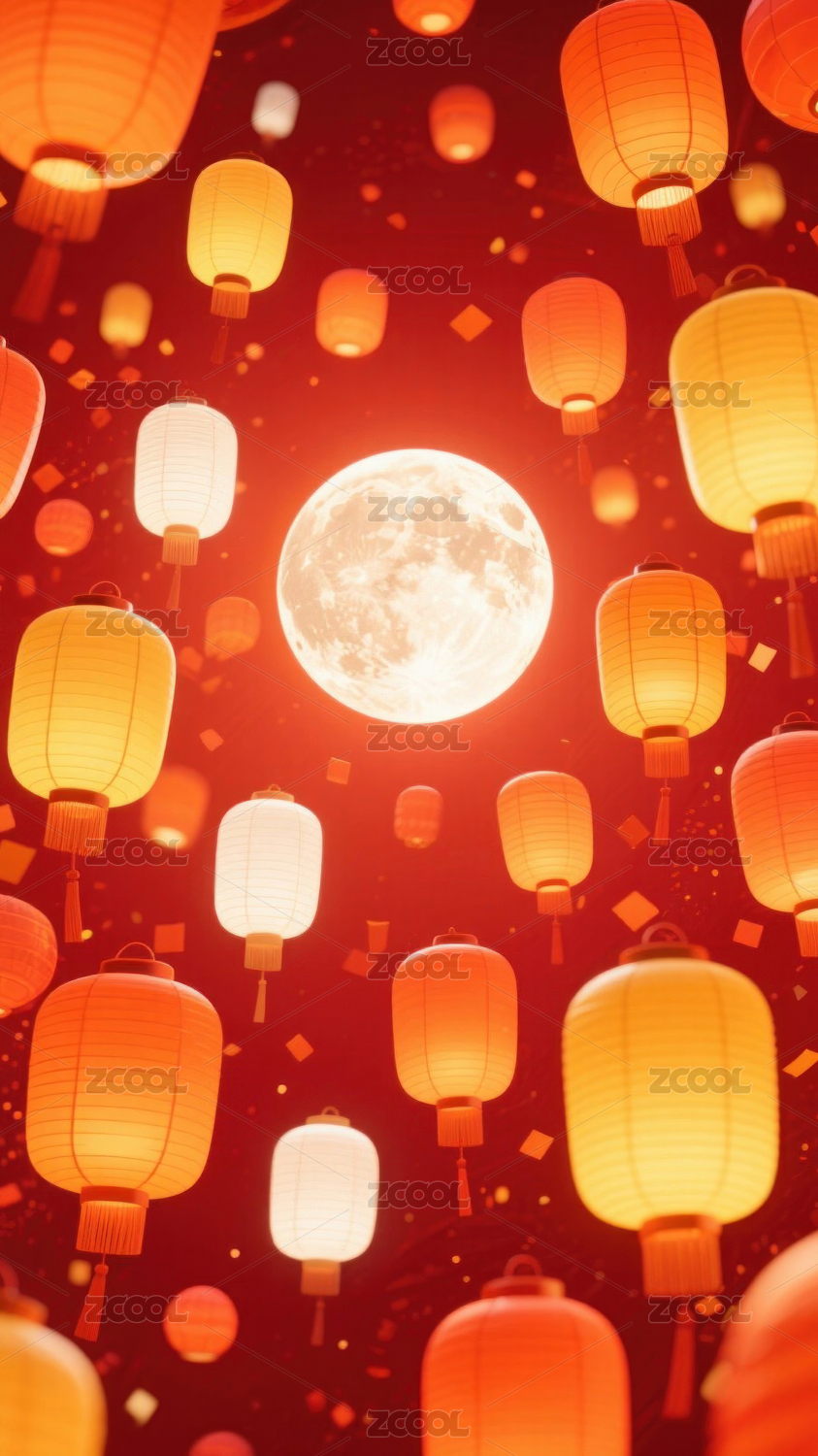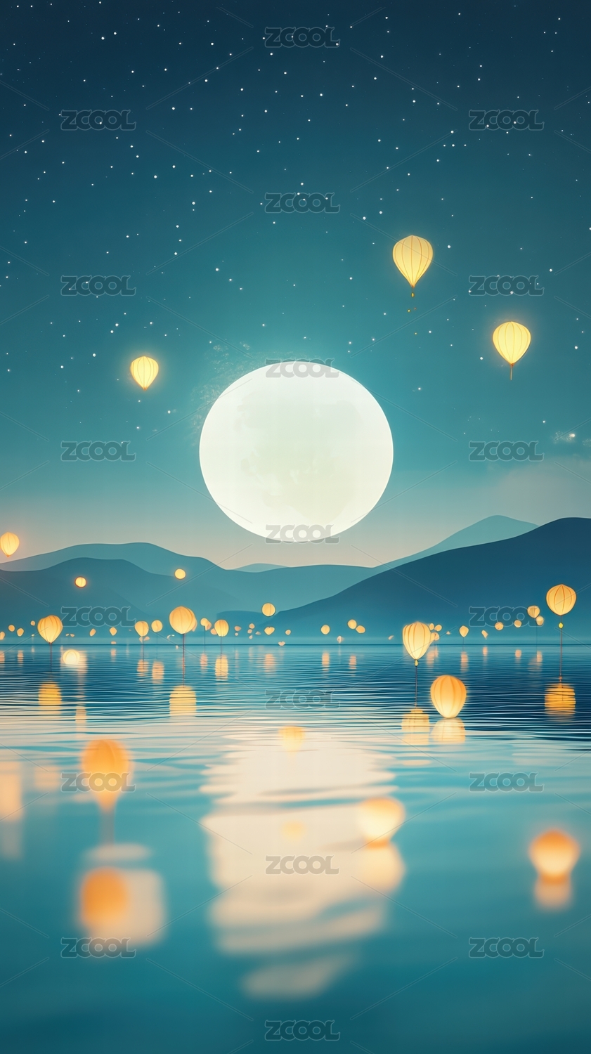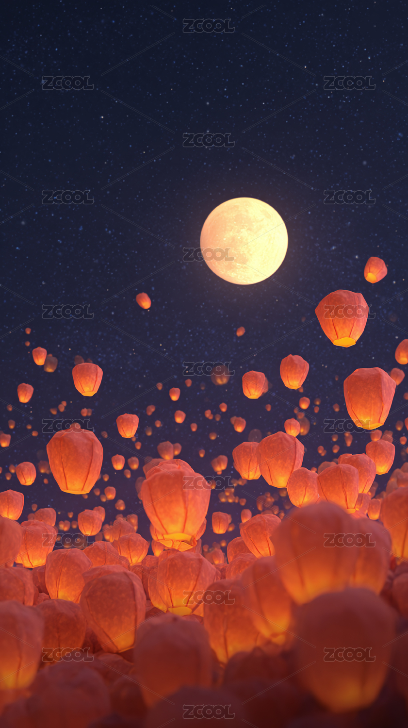 意境,浪漫,传统,插画,孔明灯,飞升,夜空,星星,月亮,夜晚