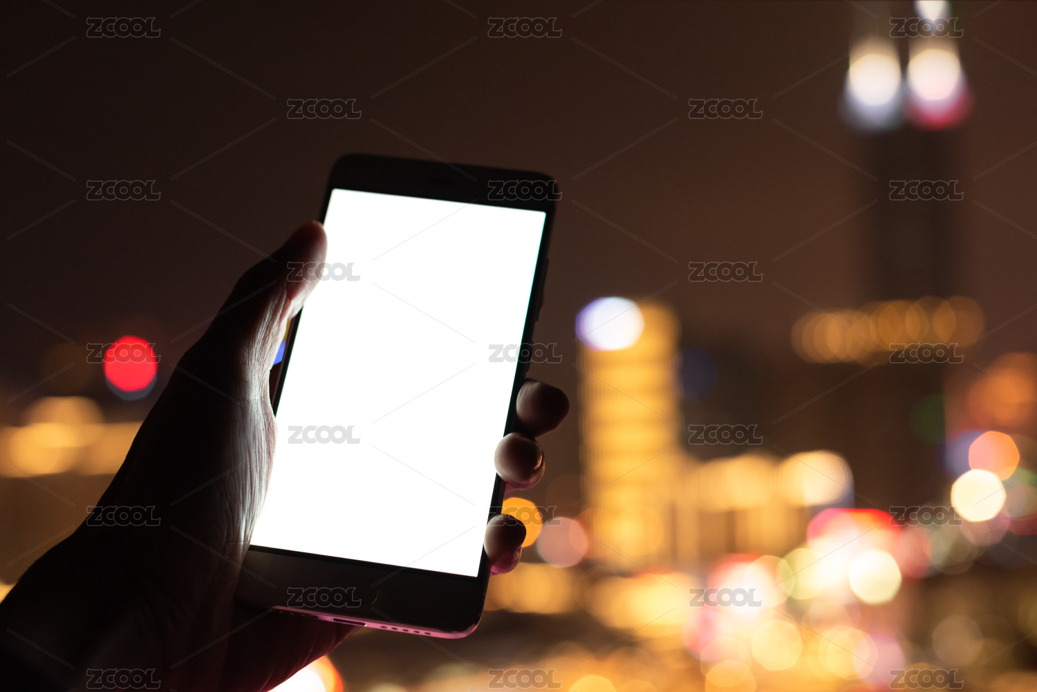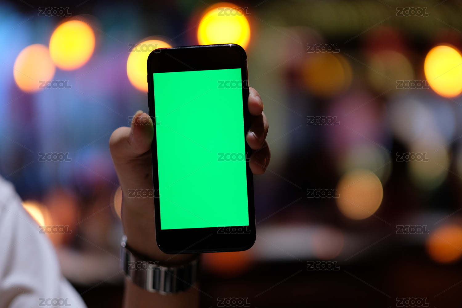 手展示绿色屏幕的手机和夜晚多彩的城市光斑