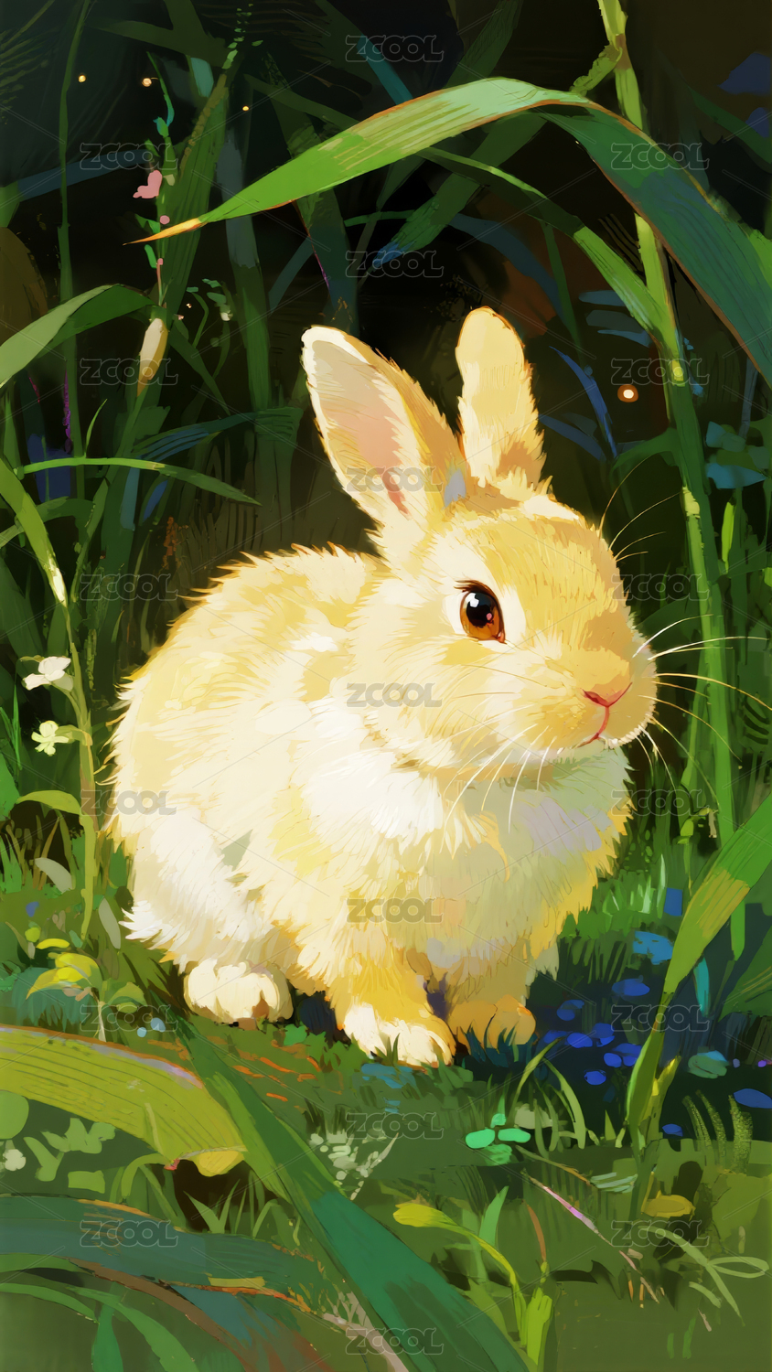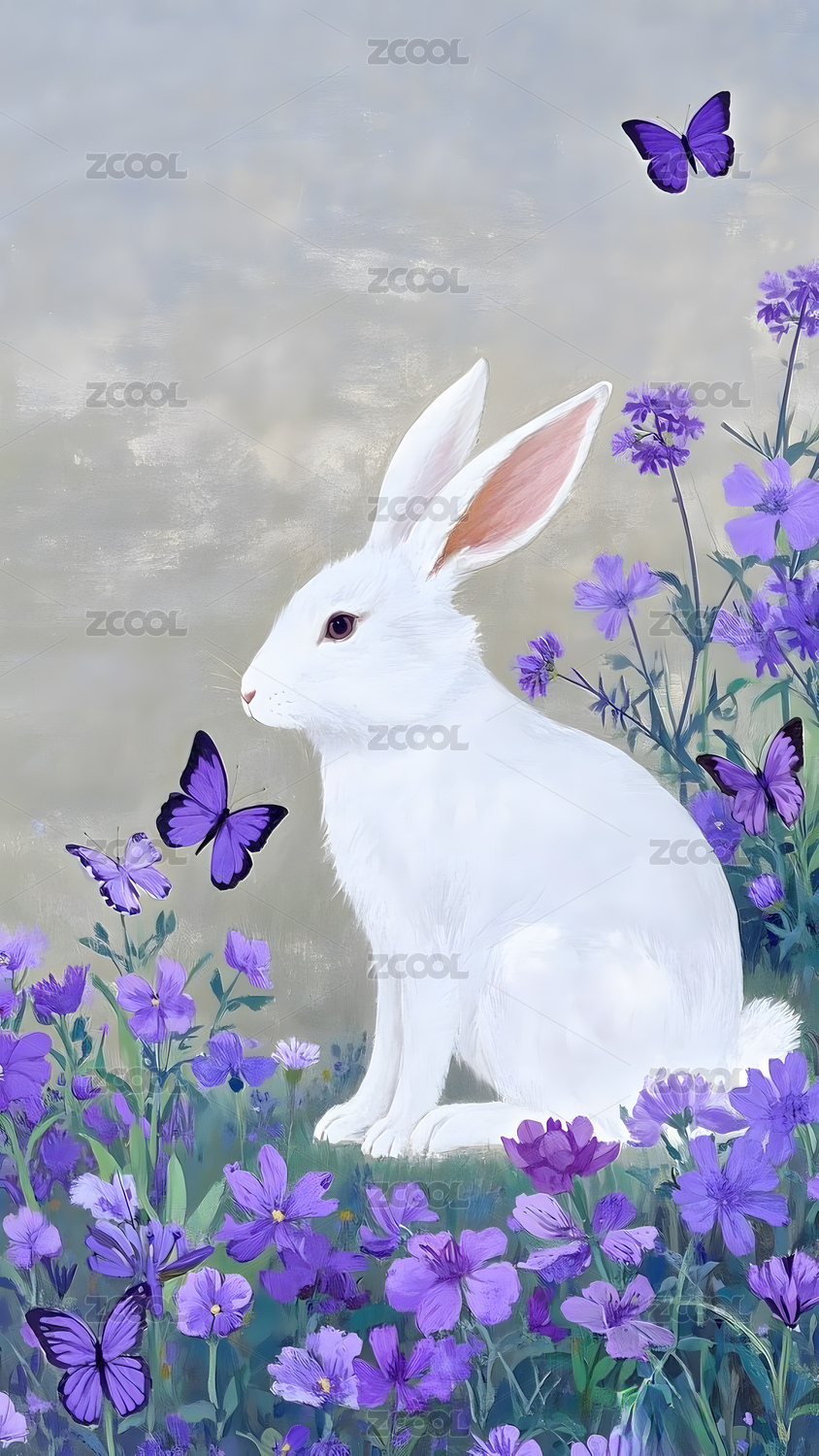 兔子,白兔,岩石,紫花,草,水彩,水墨,国风,插画,壁纸