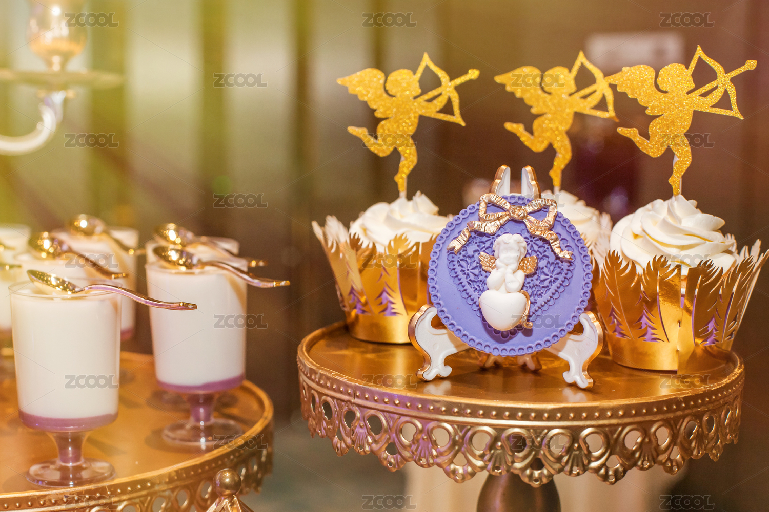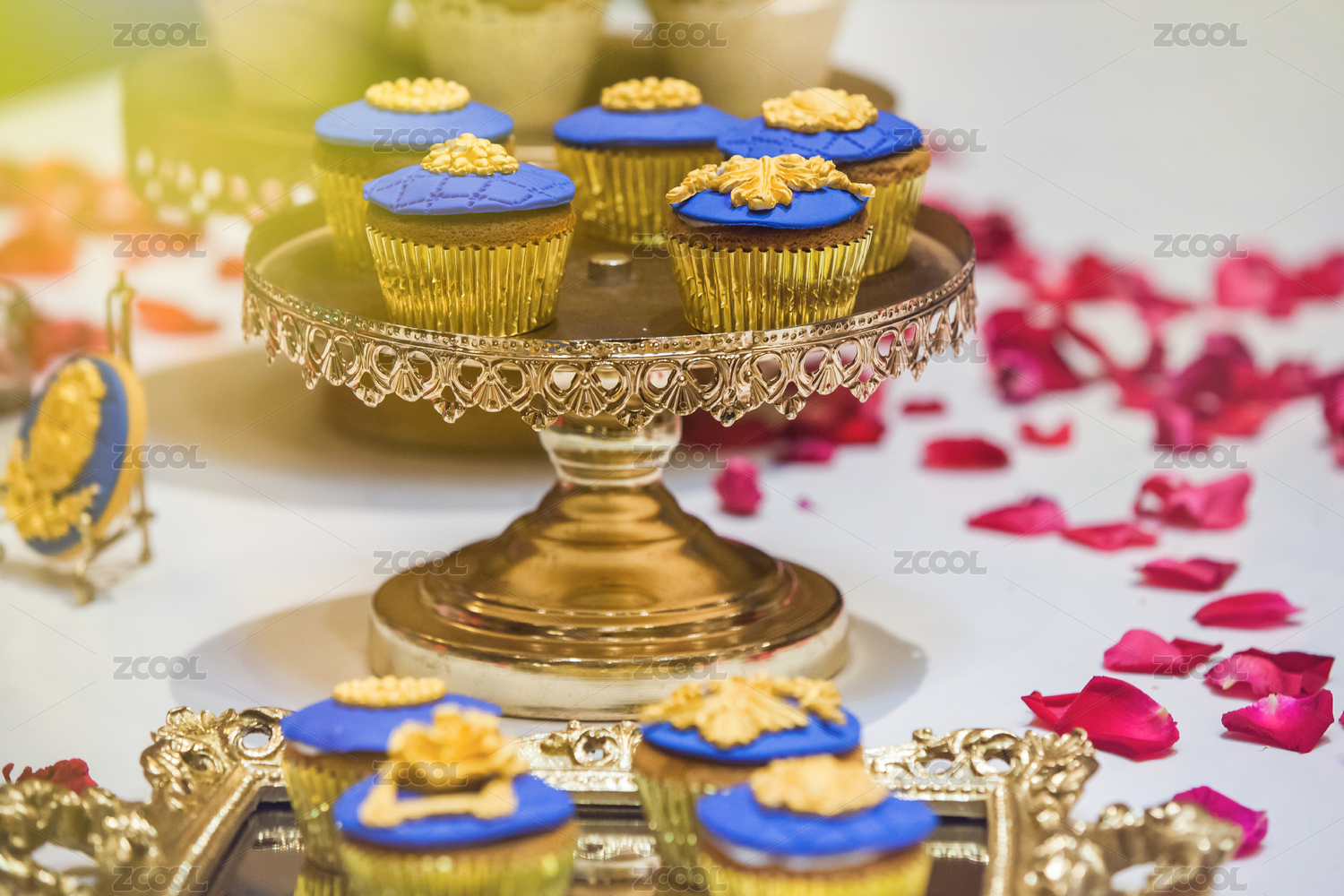金色托盘上的杯子蛋糕和布丁,欧式奢华甜品