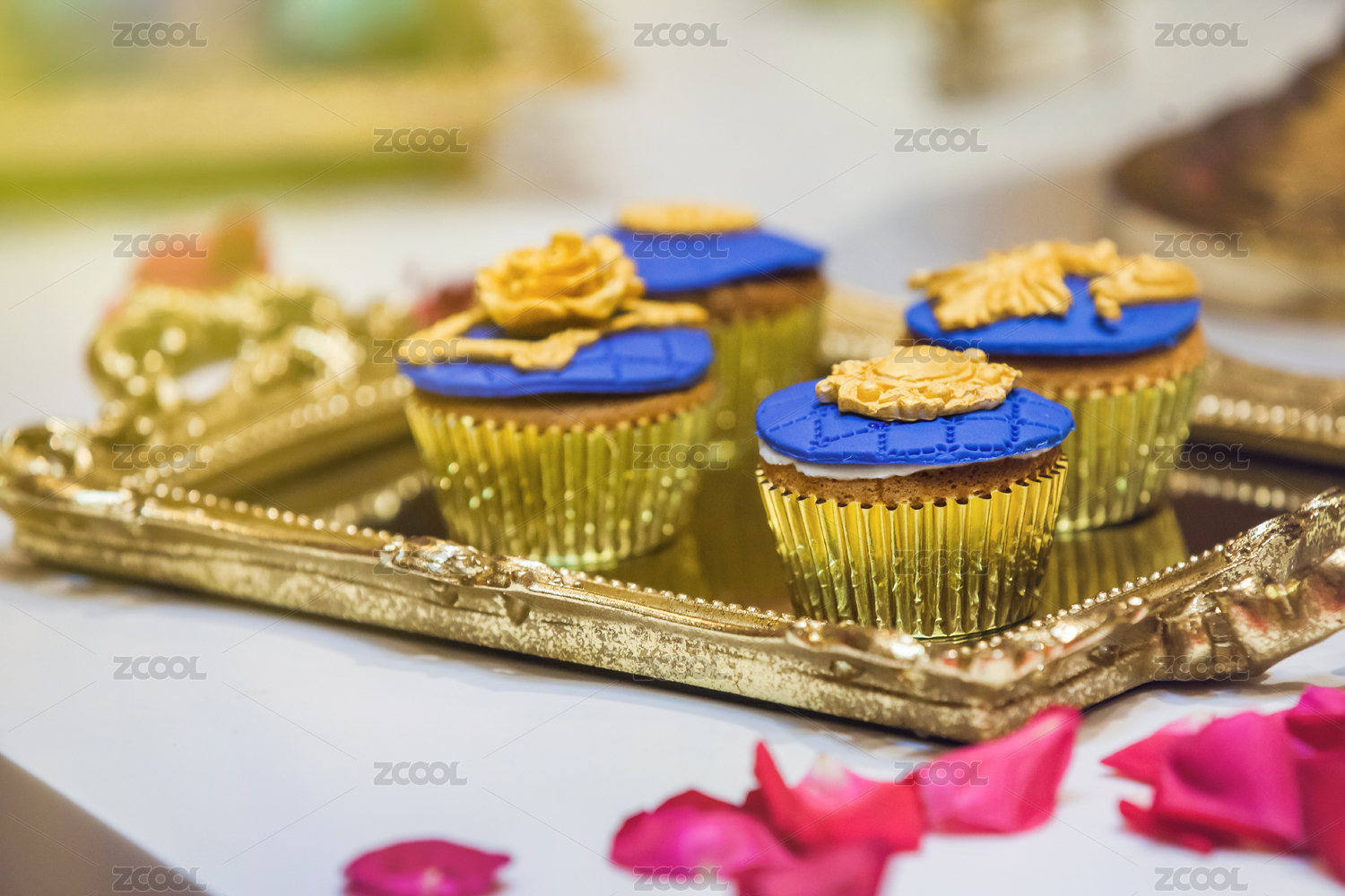 金色托盘里摆放着蓝色系杯子蛋糕。