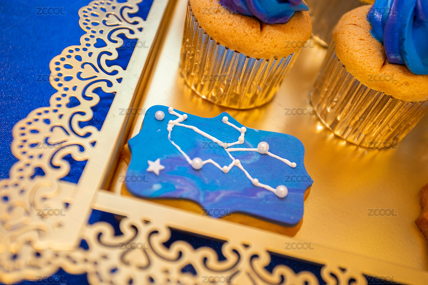 桌子上摆放着蓝色的造型饼干和布丁罐。