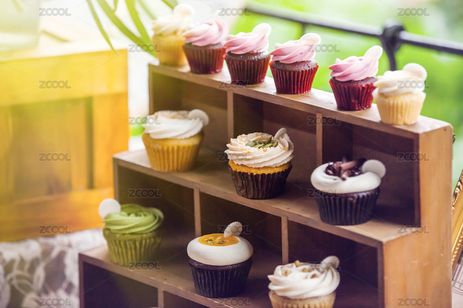 金色托盘上的杯子蛋糕和甜甜圈,欧式甜品