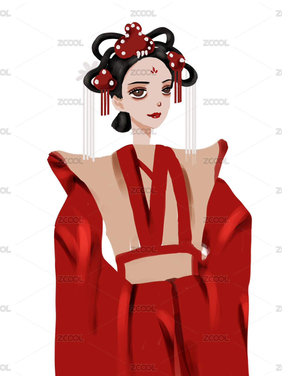 碎花裙子仕女手拿红丝带矢量插画古代仕
