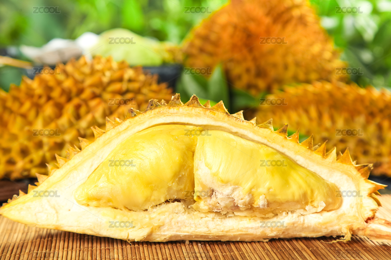 带皮,刺,掰开,芝士,榴莲,烤,芭蕉叶,金黄色,烤焦,美味