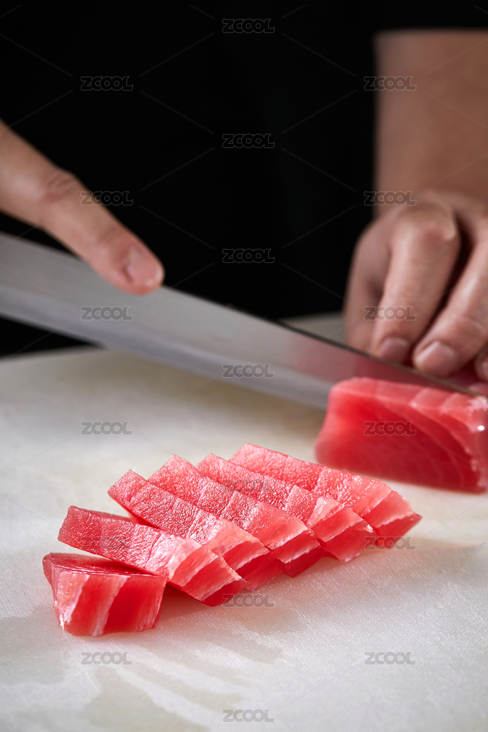 白色砧板上厨师用精湛的刀工展示鱼脍