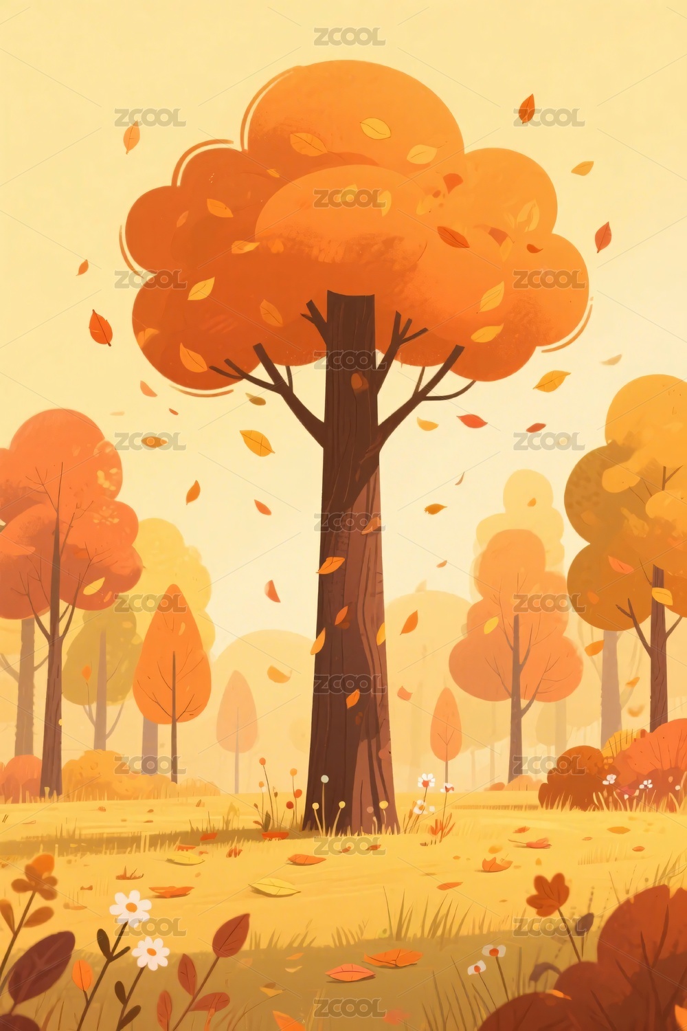 秋天扁平插画暖色树林落叶
