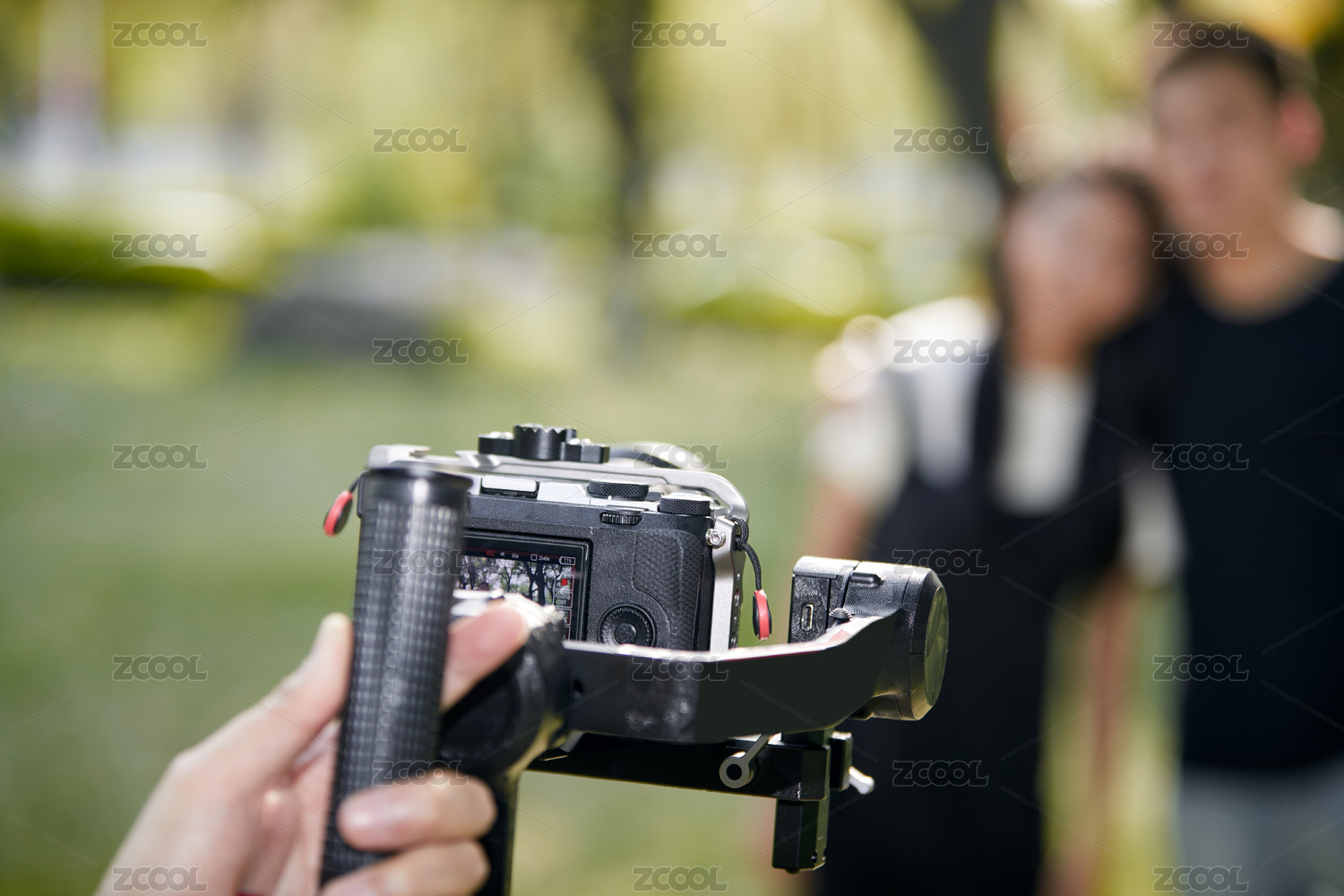 白色背景下手持摄像机进行录制拍摄的摄像师