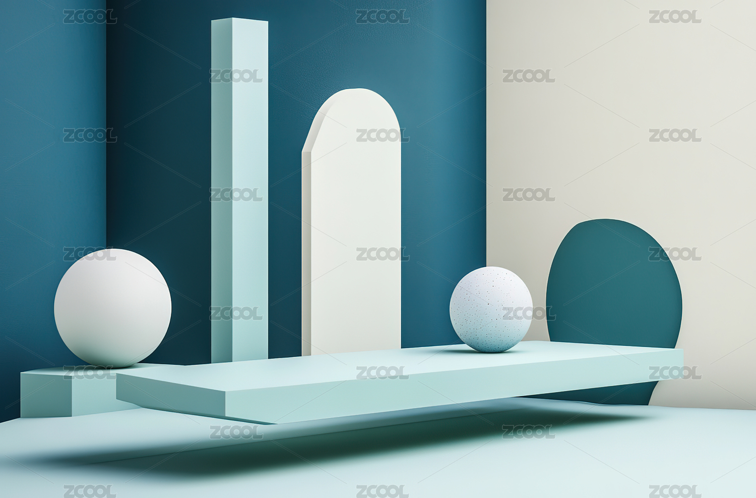 几何形体与悬浮球体的抽象场景