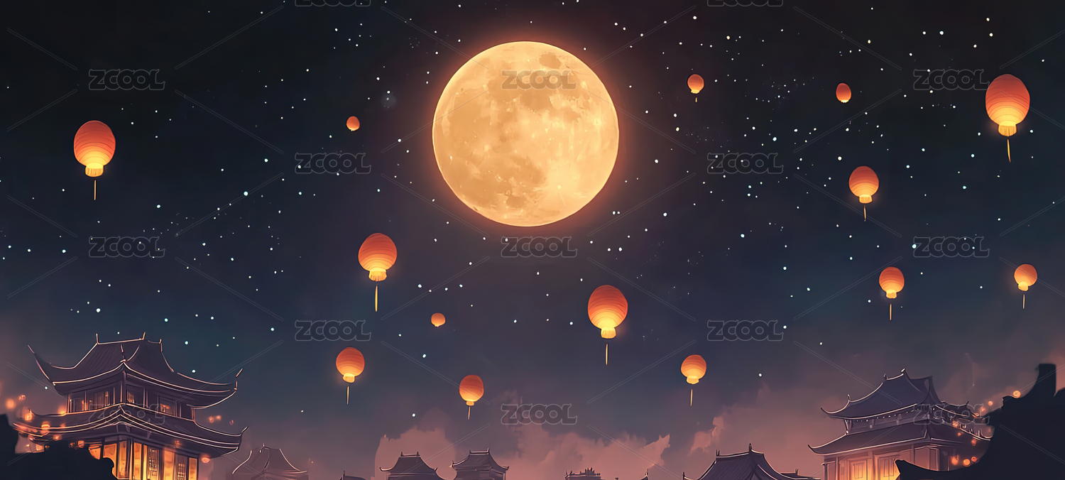 中秋佳节圆圆的月亮,灯笼高高挂起