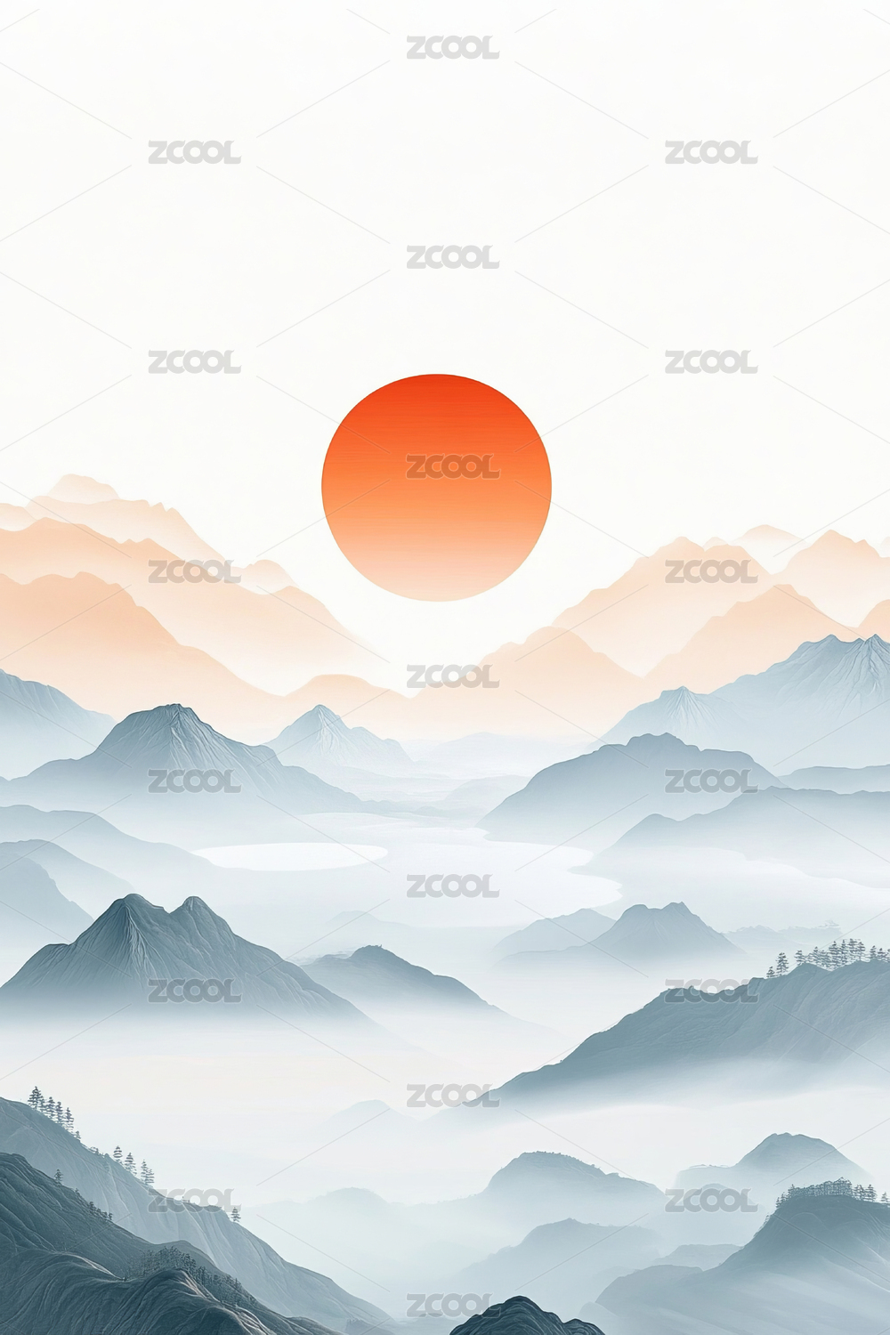 红日悬于水墨山峦之上
