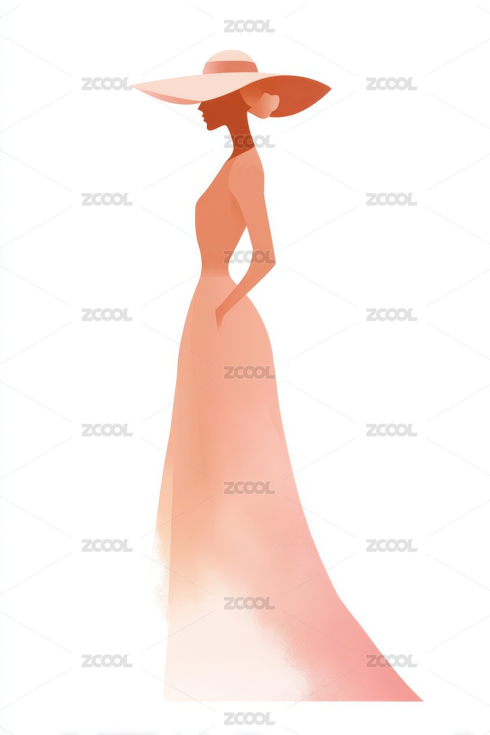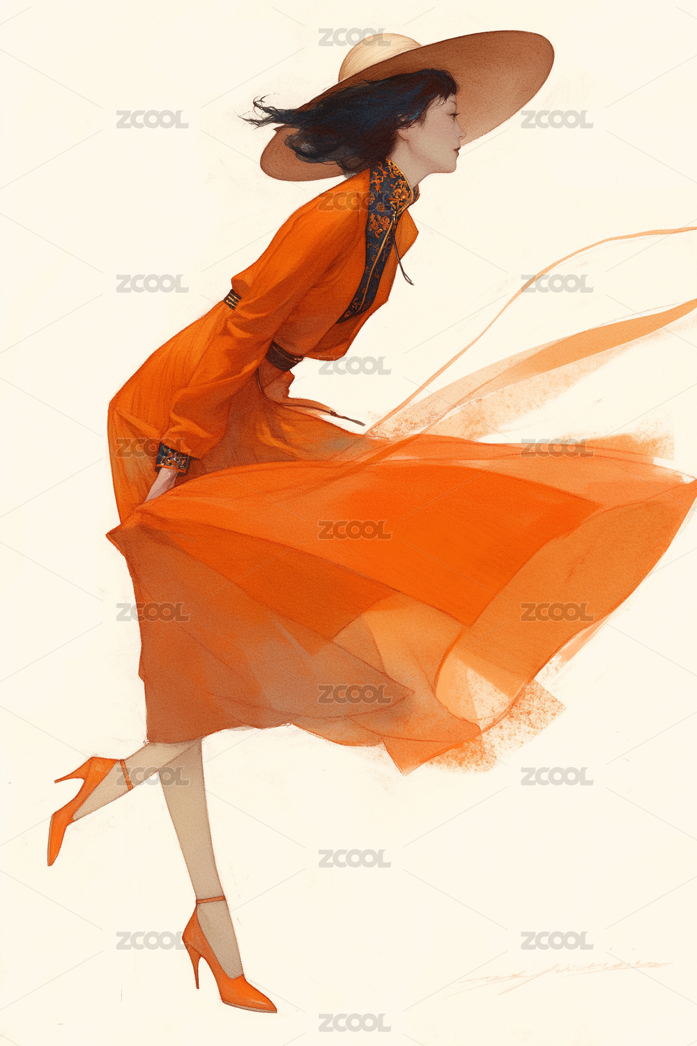 时尚女性身着红衣黑帽,背景为抽象的橙色笔触